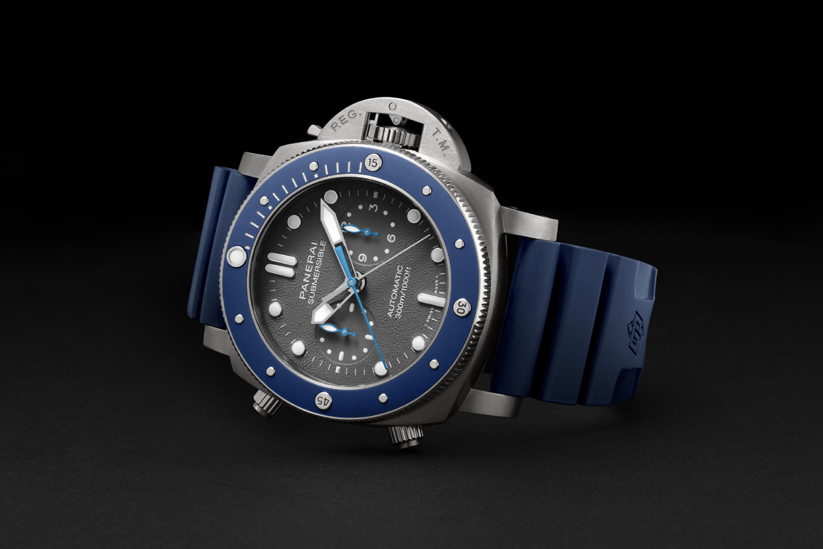 PANERAI Submersible Chrono Guillome Néry Edition Cassa (47 mm) in titanio satinato, impermeabile fino a 30 atm. Movimento meccanico a carica automatica, calibro P.9100 di manifattura, cronografo con ruota a colonne, due bariletti, autonomia di 3 giorni, funzione flyback e secondi continui. Quadrante grené, lancette e indici applicati luminescenti, ghiera girevole unidirezionale con inserto in ceramica, vetro zaffiro, fondello inciso, cinturino in gomma. Dedicato al campione francese di apnea. 18.900 euro