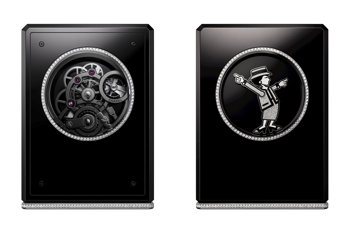 In edizione limitata, quel Mademoiselle J12 andò subito esaurito. Ma oggi la stessa effigie rivive nel Coco Clock, un prezioso orologio da tavolo disegnato (come il predecessore) dallo Studio Creativo Chanel. Ovvero da Arnaud Chastaingt e il suo team, che si devono essere divertiti come matti a realizzarlo. Sul quadrante in ossidiana si staglia la figurina di Mademoiselle, completamente tempestata di diamanti e con tre mini-perle (vere) ai polsi e all’orecchio. Ad animarla, un calibro a carica manuale, squelette, di manifattura.