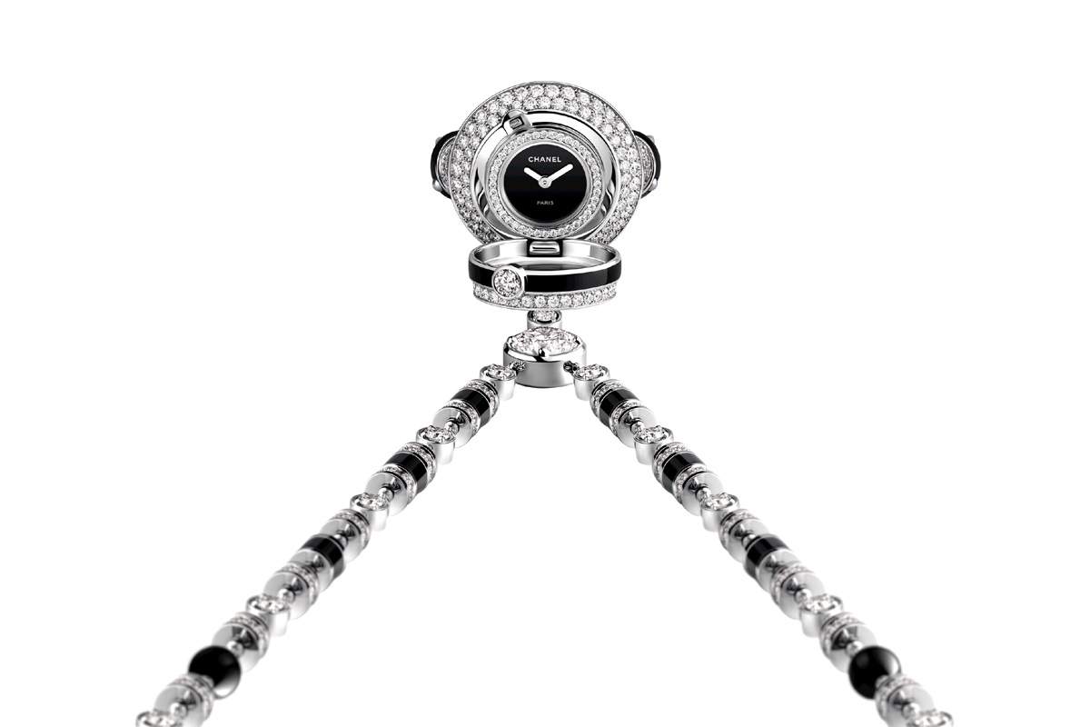 Non paghi della pendulette, i tecnici di Chanel si sono fatti prendere la mano e hanno creato un’intera collezione di Coco Watch. La stessa immagine, in versione 3D, appare infatti nel Sautoir Coco, in cui Mademoiselle diventa un ciondolo appeso a una collana in oro bianco con perline di onice e diamanti. In pratica si tratta di una bambolina in oro, interamente incastonata di diamanti “a neve”, ornata di profili di smalto e di quattro perle Akoya. In questo caso però la paglietta si solleva per rivelare il quadrante di un piccolo orologio, che mostra l’orario solo a chi indossa la collana. Il massimo della discrezione.