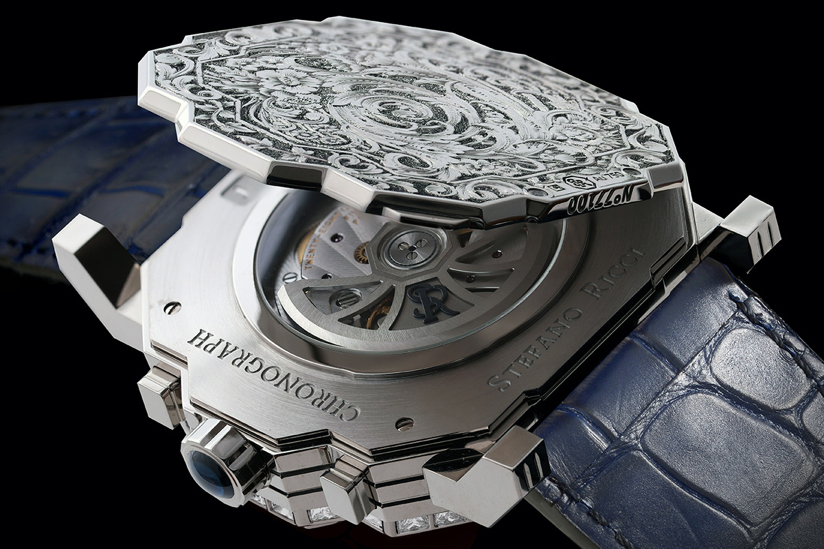 Sessanta orologi in tutto, quindi. Praticamente un orologio per ogni boutique Stefano Ricci. Orologi rari. Ancor più rari perché in ciascun esemplare il fondello trasparente è chiuso con una cuvette (uno sportellino) inciso a mano con l’antica (continuano i riferimenti alla storia) tecnica detta inglesina o English scroll. Con disegni sempre diversi. Unici.