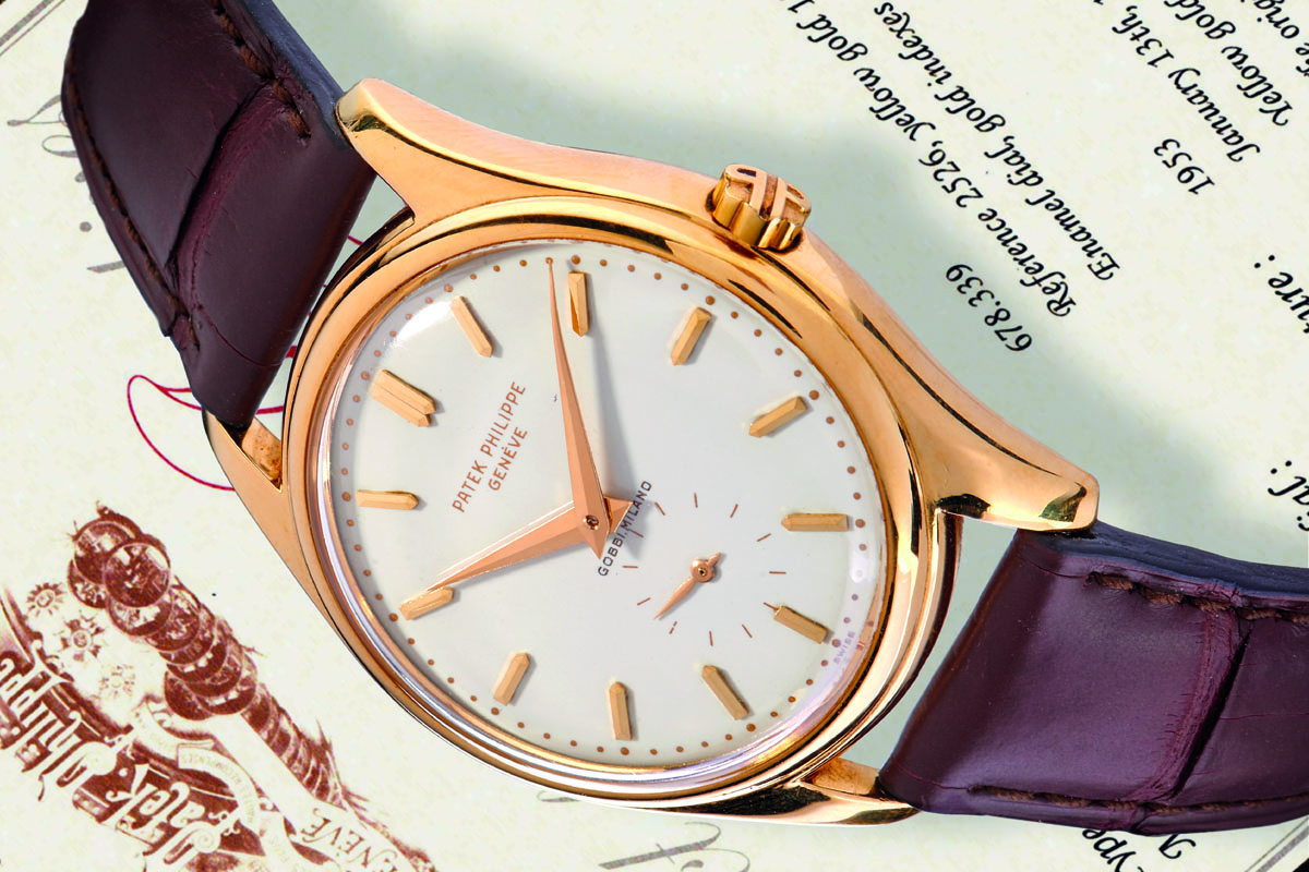 Ma veniamo all’orologio. Si tratta di un Patek Philippe Calatrava in oro, Referenza 2526 del 1954, prima serie: con quadrante in smalto bianco personalizzato da Gobbi Milano, indici a bastone applicati, scritte dorate, minuteria puntiforme, quadrantino dei piccoli secondi. Le lancette trylon sono in oro. Un orologio di grande interesse perché monta il Calibro 12-600AT, che è stato il primo movimento a carica automatica brevettato da Patek Philippe. Siglato n. 760217 e montato su 30 rubini, ha il rotore in oro 18K decorato a guilloché, lo scappamento ad ancora, il bilanciere monometallico con viti di regolazione e spirale Breguet brunita. Rifinito a Côtes de Genève, è fregiato del Punzone di Ginevra. I responsabili della casa d’aste fanno sapere che è in condizioni perfette.