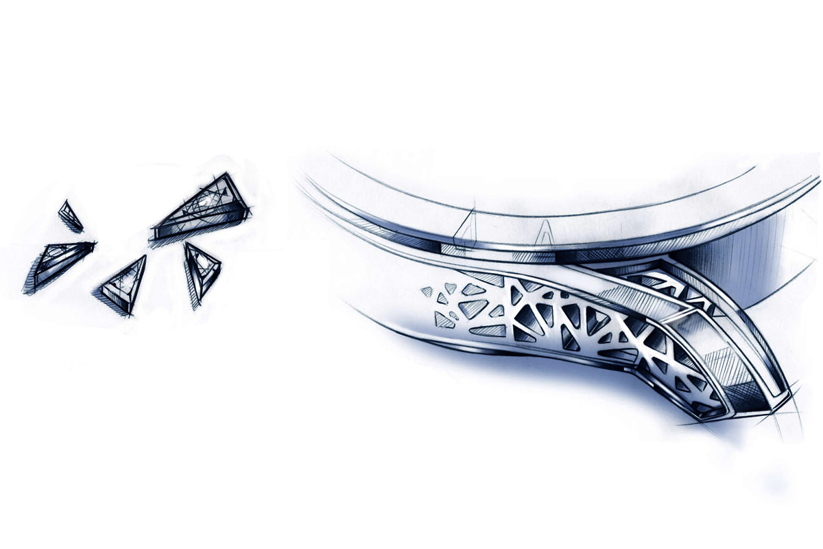 E non abbiamo ancora detto nulla del lavoro a monte, ossia della progettazione e della realizzazione di una cassa che sia solido supporto per il movimento quanto per le pietre. Anche questa è una lavorazione che richiede una gran quantità di prototipi. Se guardi il disegno ti rendi conto che la sua struttura è ispirata in qualche modo al “Nido d’Uccello”, allo Stadio Nazionale di Pechino (progettato dagli architetti di Basilea Herzog & de Meuron. N.d.R.). Una cassa grezza composta da poligoni irregolari. È già bella così, anche senza pietre…