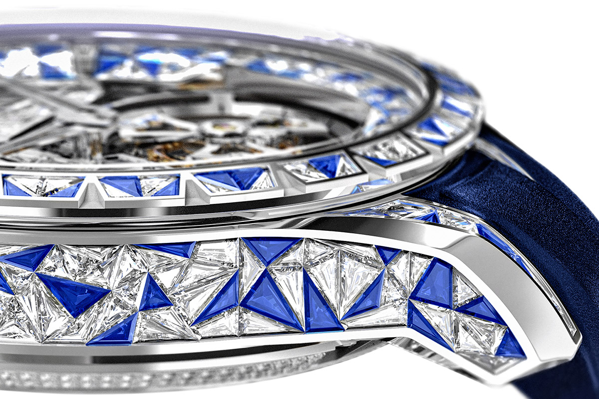 In pratica, seguendo il progetto elaborato in collaborazione con l’artista giapponese Kaz Shirane, si è creata una cassa in oro bianco composta da poligoni irregolari destinati a montare le gemme. La tecnica usata è quella dell’incastonatura invisibile, qui resa particolarmente complicata dal fatto che i 600 triangoli irregolari alla base devono ospitare altrettante pietre preziose tagliate una per una in tetraedri irregolari. Che infine devono essere adattati per poter combaciare, sì, ma senza forzarsi a vicenda per evitare che le pietre si spezzino.