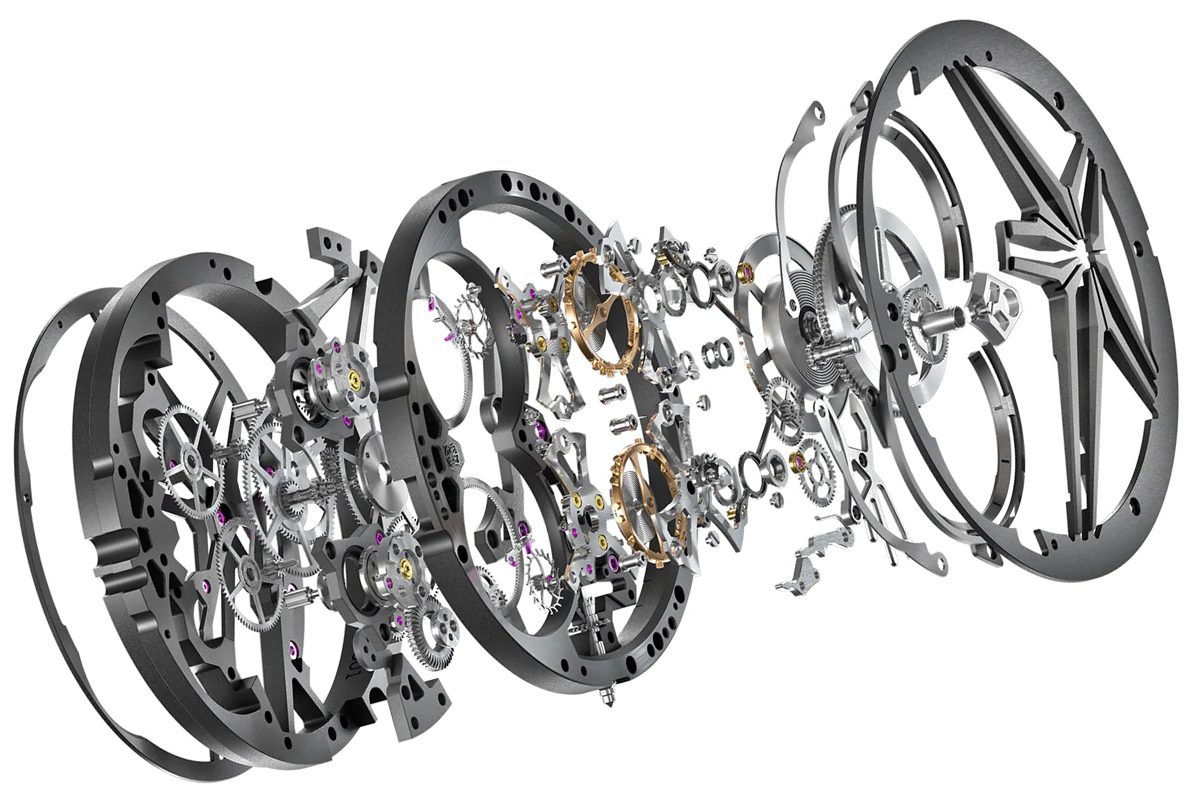 Dopodiché c’è l’eccellenza tecnica dei movimenti Roger Dubuis. Un patrimonio già importante, specialmente per quanto riguarda i tourbillon multipli, che però avete in qualche modo aggiornato per l’occasione. Ad esempio con il bariletto “volante”, cioè fissato solo inferiormente sulla platina. O meglio, su quella parte scheletrata, una stella, che funge da platina, ossia da base per la meccanica.
