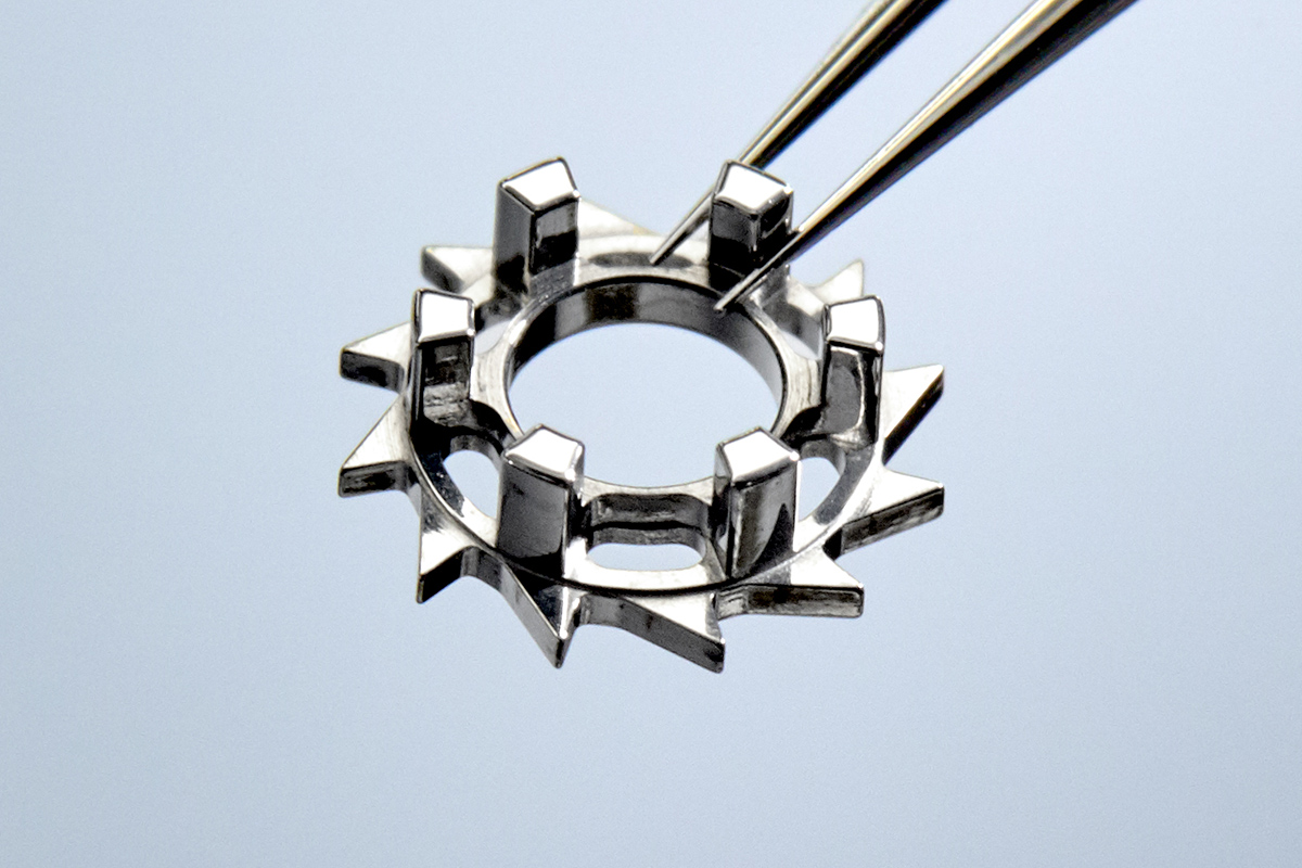 In estrema sintesi, quando si preme il pulsante di avvio dell’RM 72-01, una gran bella ruota a colonne (si è scelta quella a sei colonne) muove non la solita ruota intermedia, ma un pignone verticale; che si sposta in un (brevissimo) percorso obbligato, collegando la ruota dei secondi del movimento e quella dei secondi crono. Tramite una lunga bascula si sposta contemporaneamente un secondo pignone (di forma diversa) che si ingaggia con il bariletto; e che quindi prende direttamente da lì l’energia necessaria per il funzionamento dei totalizzatori per minuti e ore. In tal modo la ruota dei secondi del movimento non trascina l’intero dispositivo cronografico, ma si limita a consentire il conteggio esatto dei secondi; quello dei minuti e delle ore (fino a 24!) crono è affidato invece al secondo pignone.