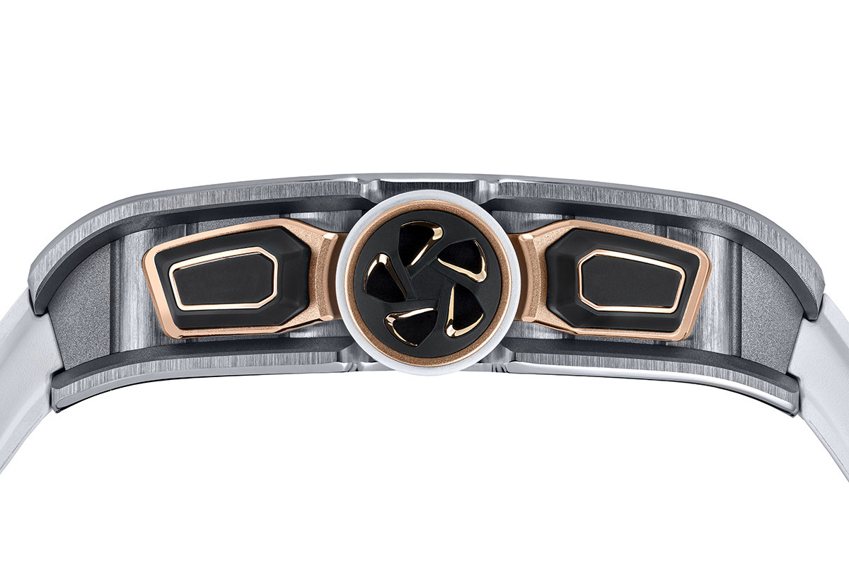 Anche per questa ragione i tecnici di Richard Mille sono intervenuti sulla ricarica automatica (bidirezionale, con massa oscillante in platino che conferisce maggior efficienza), e sul bariletto stesso. Hanno cioè reso più rapida la ricarica, con il fine non tanto di aumentare l’autonomia complessiva – che comunque è molto buona: circa 50 ore ±10%; quanto l’efficienza della ricarica stessa. Hanno così ridotto la possibilità di far entrare l’orologio in quella fase di “riserva” – quando l’autonomia residua scende ad un terzo di quella totale – che già di per sé altererebbe il funzionamento del bilanciere. Sembra una questione sottile – di lana caprina, come si suol dire – ma attenua davvero molto la naturale imprecisione tipica dei cronografi.