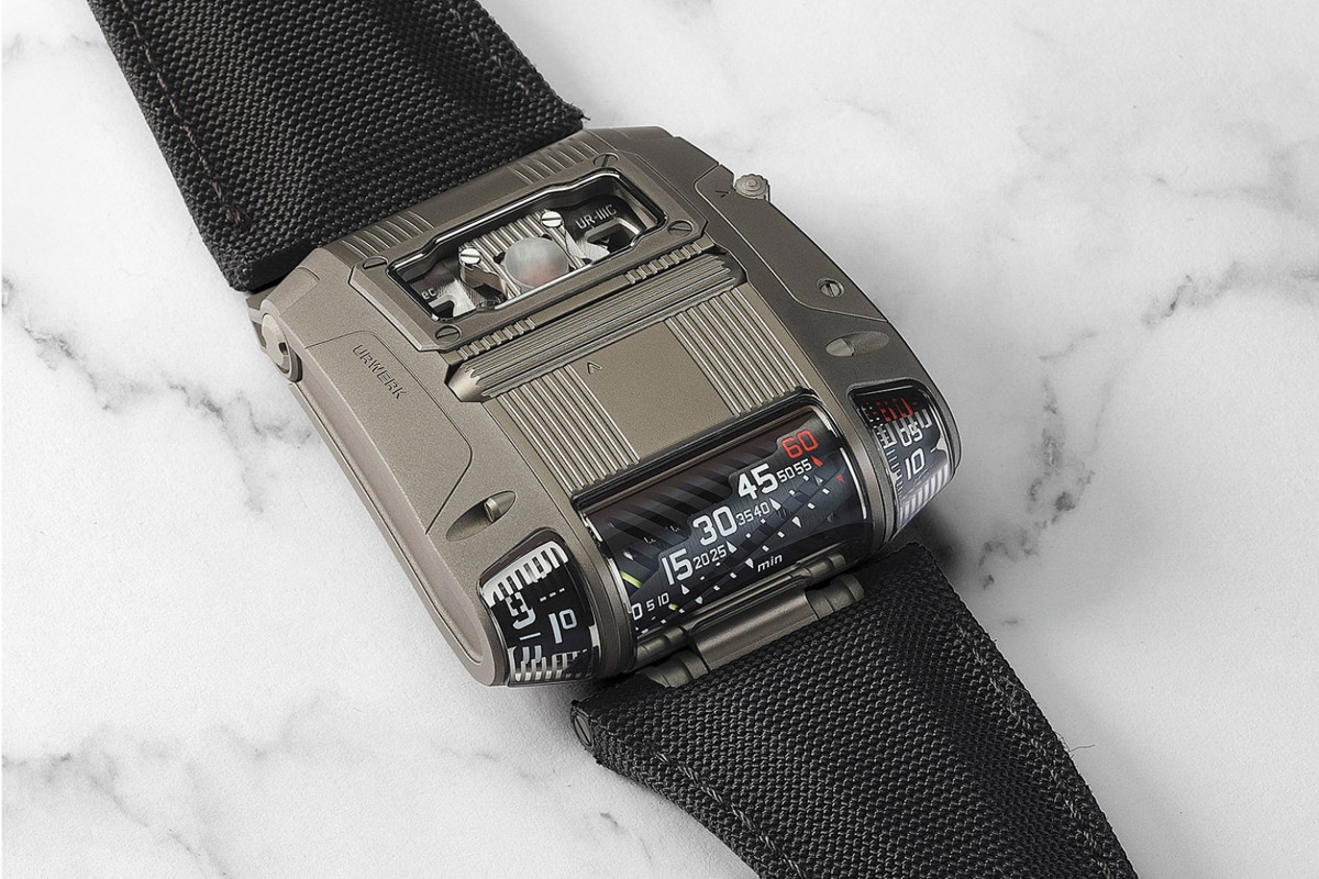Lo dimostra la referenza Ur.111C, in cui è perfettamente riconoscibile la firma della coppia. Basta leggere la descrizione per farsene un’idea precisa: «Un nuovo display del tempo lineare in cui ore e minuti sono indicati tramite coni rotanti. Sul lato sinistro sono indicate le ore, il palco centrale è riservato ai minuti: un cilindro con un indice giallo risale la traccia dei minuti e, raggiunto l’indicatore rosso dei 60 minuti, salta di nuovo a zero facendo girare il cilindro delle ore su quella successiva. Sulla parte superiore della cassa c’è l’indicazione dei secondi».