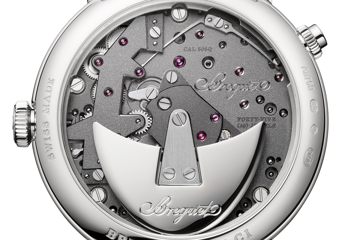 Cominciamo proprio dal datario. Le cifre sono riportate su una fascia piuttosto ampia, che sembra sospesa in aria; in realtà è applicata nella parte inferiore dell’orologio. La data è indicata da una lunga lancetta che parte dal centro del movimento, dove è posto il bariletto. La lancetta del datario è “scalinata” (nelle foto qui sopra è ben visibile) per poter passare sopra l’organo regolatore e gli ingranaggi che portano alla ruota mediana. Una soluzione abbastanza elegante che consente di evitare impossibili rimescolamenti di parti essenziali del movimento (Calibro 505Q, variante del Calibro Breguet 505SR1), mantenendone l’ipnotica struttura.