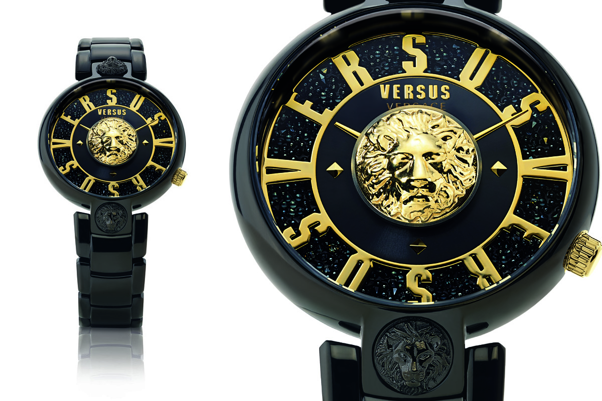 E le teste leonine arricchiscono anche i due esemplari al femminile. Versus Lodovica è il più aggressivo, quasi dirompente nella versione dal total look nero; illuminato da dettagli dorati (il logo a lettere cubitali e il Leone, appunto), si basa sullo sviluppo di un bestseller di Versus Versace: il Kirstenhof. Stesso bracciale rastremato, stessa costruzione della cassa (da 39 mm di diametro); simile anche il quadrante di formato ridotto, circondato da uno spazio trasparente e decorato dal logo a caratteri macro. Nel Ludovica, però, lo spazio tra due vetri è riempito di una miriade di cristalli Swarovski, rigorosamente neri, che ne accentuano il glamour.