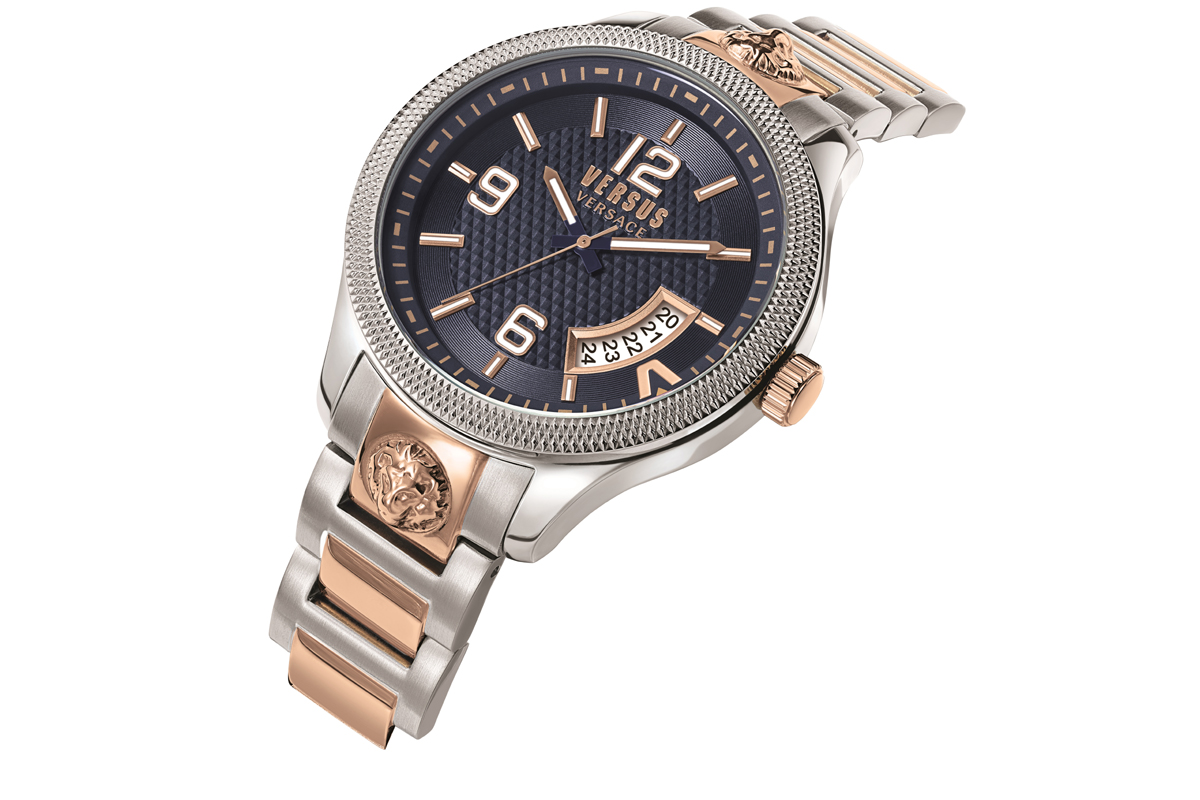Una forte personalità che si ritrova innanzitutto nel modello maschile. Versus Reale esibisce una particolare lunetta martellata, che abbraccia il quadrante effetto guilloché dalla doppia lavorazione; a ore 4 una V sovradimensionata sormonta una grande finestra ad arco del datario. La cassa di dimensioni XL sfodera al centro delle anse, sulla maglia d’attacco del bracciale, due Teste di Leone in 3D; che risaltano con maggior impatto nella versione bicolore (acciaio/acciaio Pvd oro rosa).