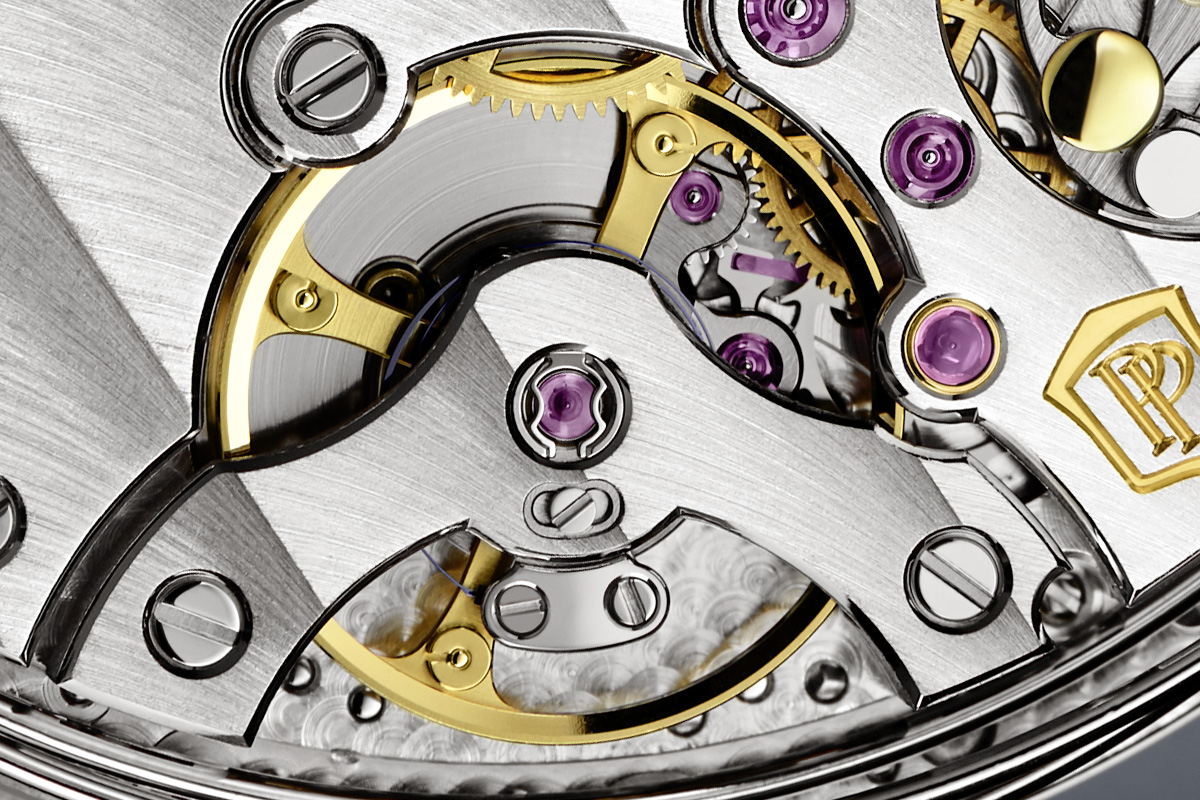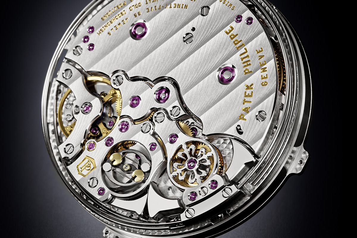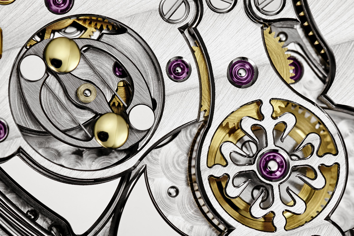 Analizziamo ora l’interno dell’orologio e scopriamo il nuovo movimento Calibro GS 36‑750 PS IRM (GS sta per Grande Sonnerie, PS per Piccoli Secondi, IRM per Indicatore dell’autonomia residua) montato nella Ref. 6301. Sul lato del quadrante il movimento include, in particolare, il meccanismo dei secondi saltanti. Il ritmo del secondo è scandito da una bascula che si innesta sulla ruota che fa muovere la lancetta dei secondi.