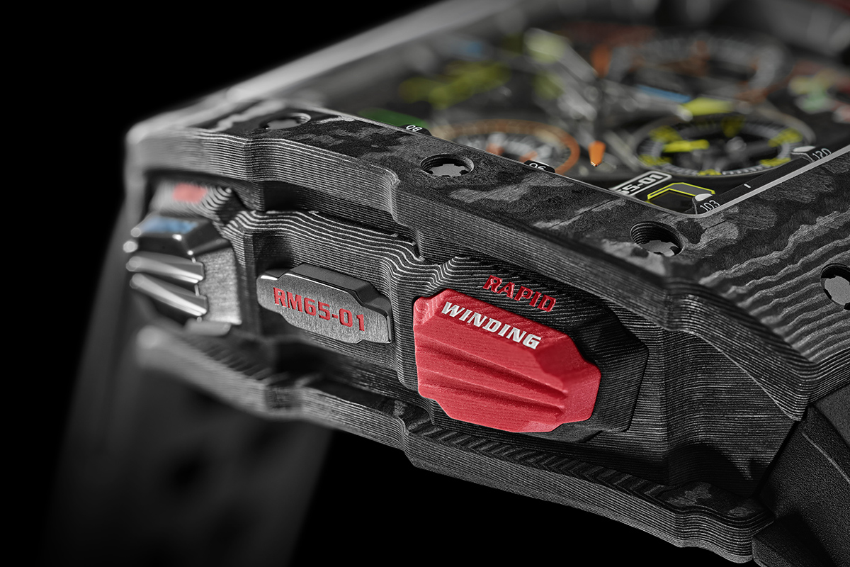 Eccolo, l’alleggerimento, subito. Complice un’altra di quelle cartelle stampa particolarmente ben fatte, ricca di foto ad altissima risoluzione, ho giocato con Photoshop per far godere gli occhi. Parlo del Richard Mille RM 65-01, cronografo sdoppiante con movimento meccanico a carica automatica. Nessuno più di Richard Mille colpisce gli occhi per la fantasmagoria di dettagli, per i fuochi artificiali di minuscoli particolari che rischiano di sfuggire anche ad un esame sotto la lente d’ingrandimento.