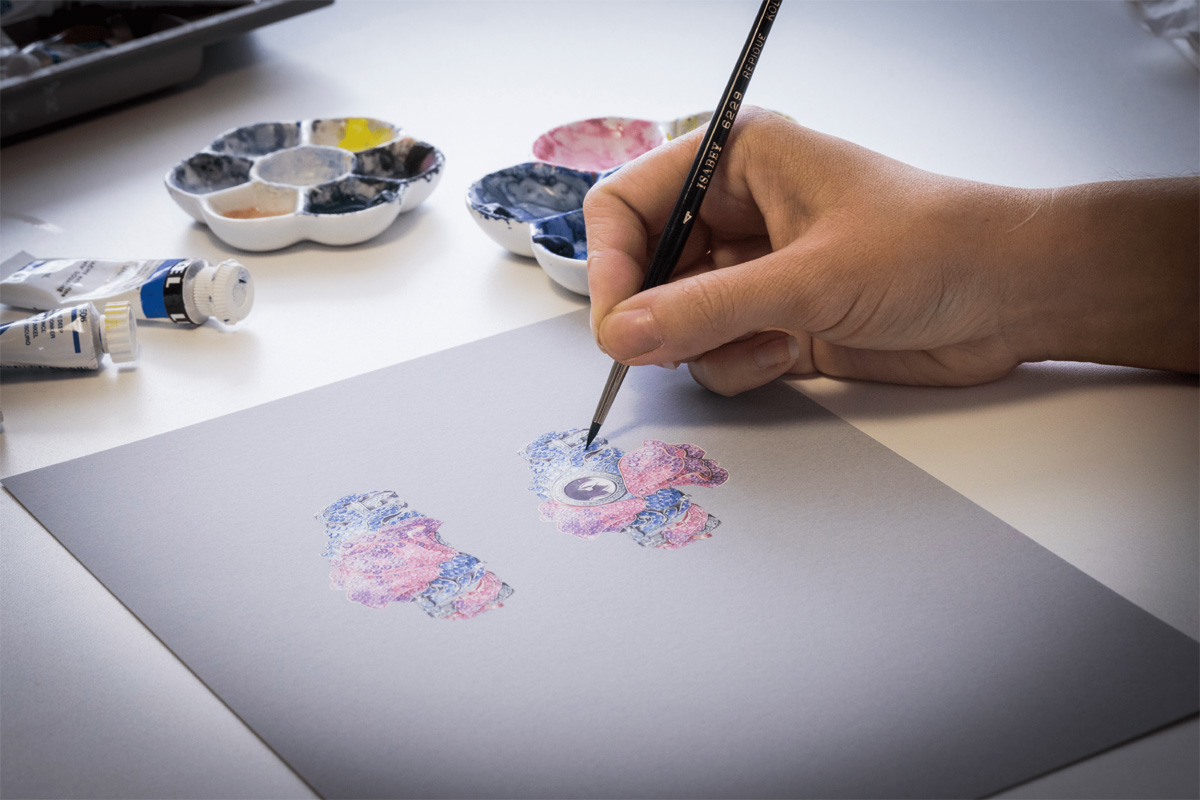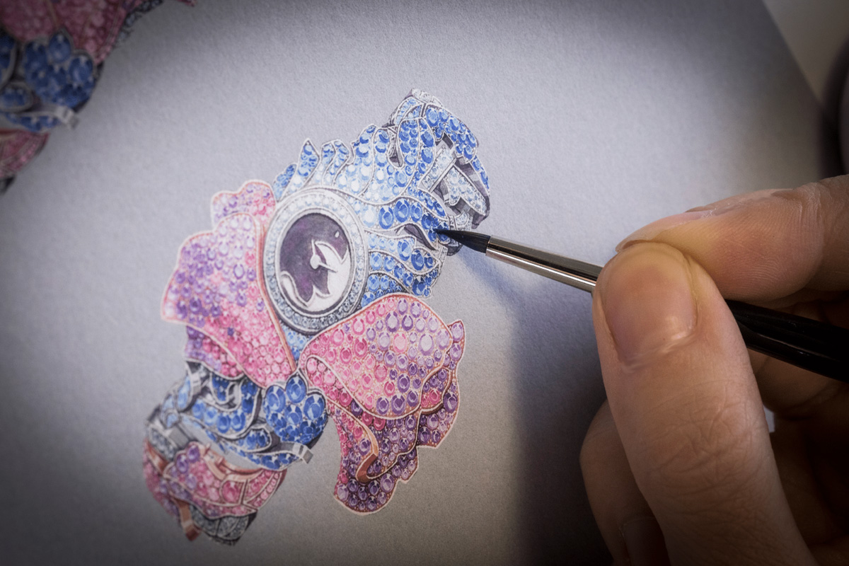 Dopo alcuni schizzi, più o meno numerosi, un disegno (o gouache) definisce l’orologio nei minimi particolari: i volumi e le proporzioni, le linee, i colori, così come i materiali e le carature delle gemme. Il risultato finale è un’illustrazione assolutamente precisa, che servirà da guida per la costruzione del primo modello in cera. La tecnica qui utilizzata è infatti quella della cera persa.