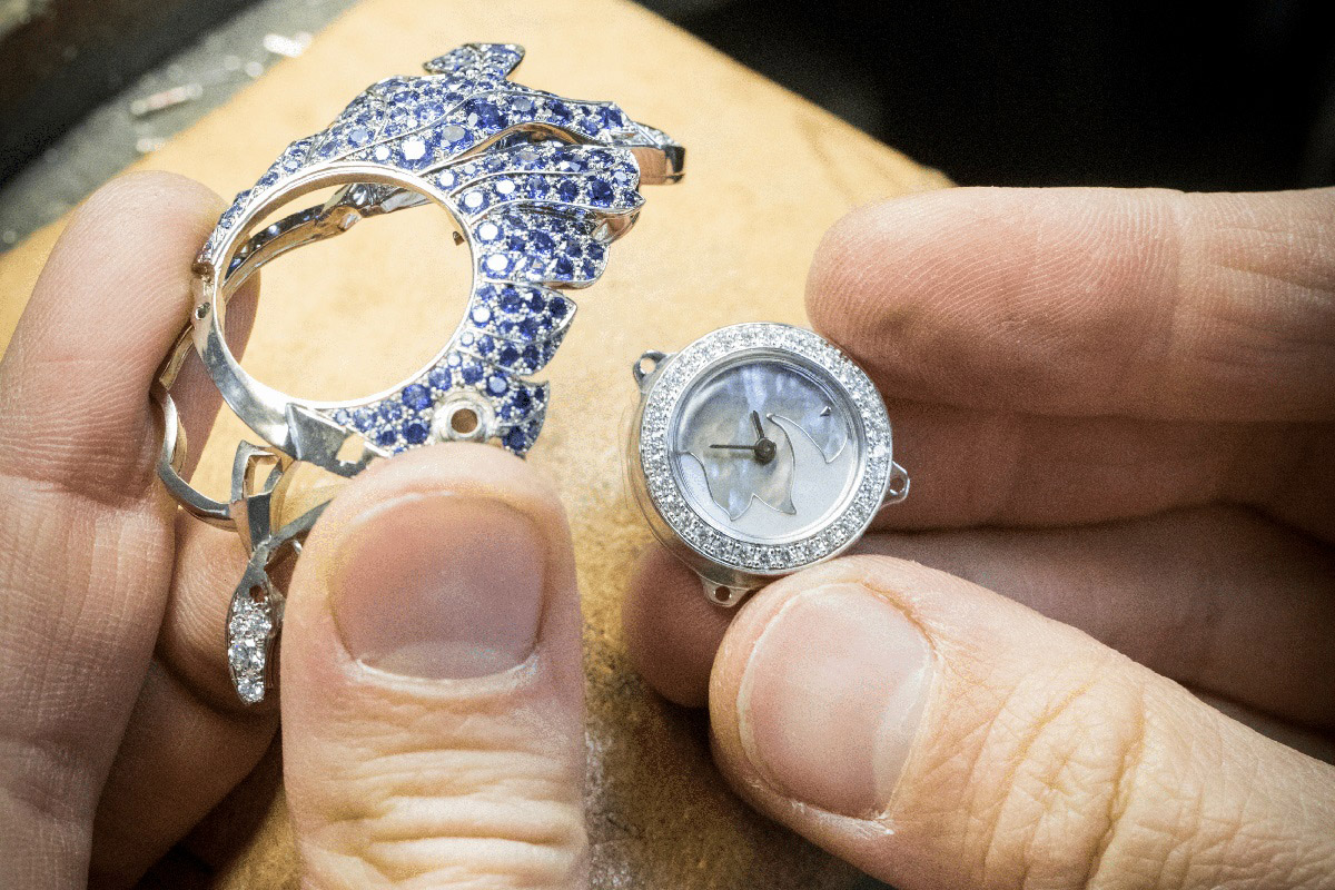 Una volta approvati, i diversi elementi sono rifiniti e lucidati una prima volta. Quindi incastonati con pietre preziose accuratamente selezionate per purezza, intensità di colore e taglio. Le gemme sono montate a mano, una ad una, con diverse tecniche, già previste in fase di progettazione. Infine, i vari componenti sono nuovamente lucidati e finalmente assemblati.