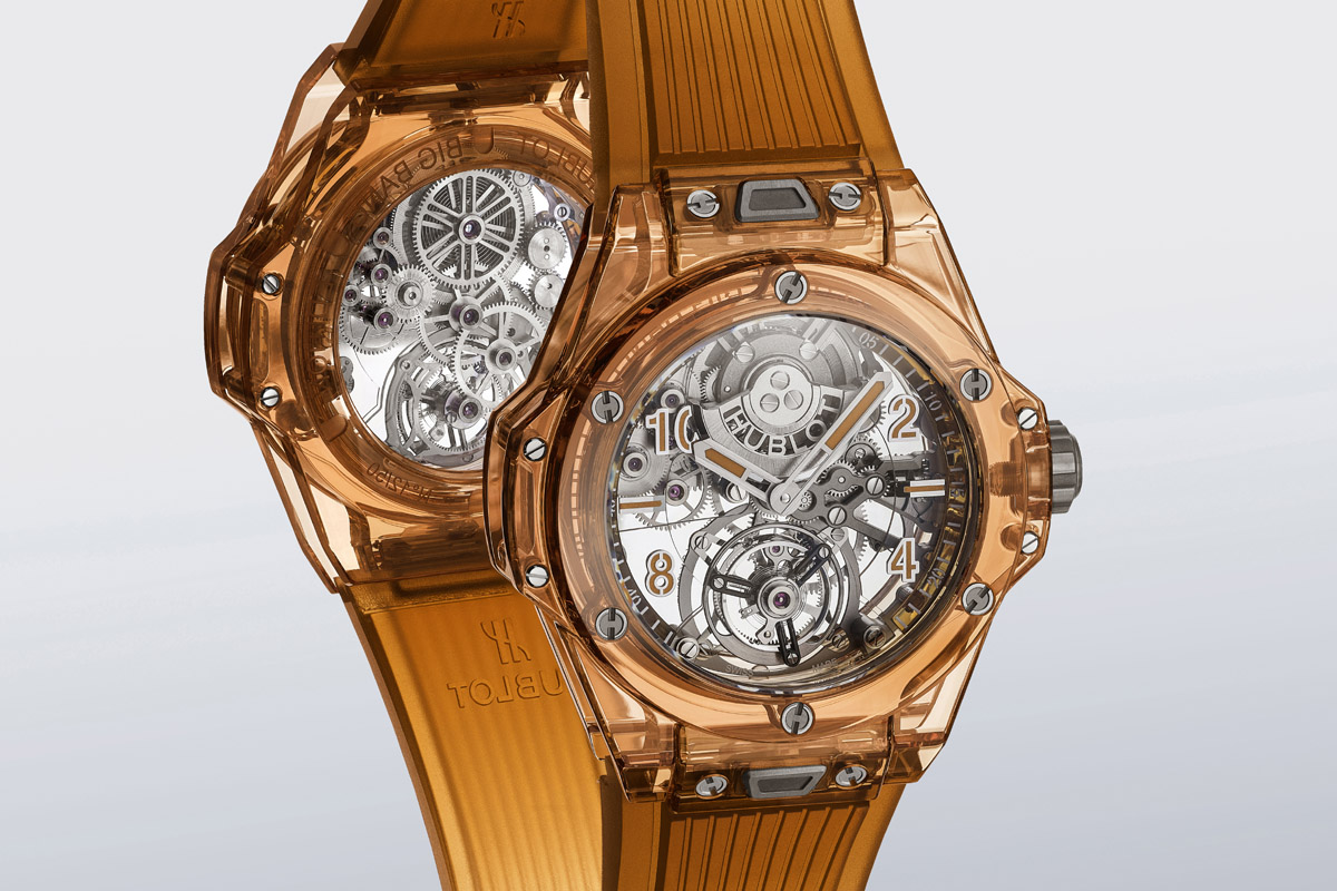 Cominciamo quindi con Hublot, cui va il merito di aver ambientato la presentazione dell’LVMH Watch Week 2021 negli spazi della manifattura, a Nyon, in un tour fra i vari dipartimenti. Fra le tante novità in cantiere, riflettori puntati sul Big Bang Tourbillon Automatic Orange Sapphire: per la cassa in vetro zaffiro dal colore inedito – arancione – ma più ancora per il nuovo calibro automatico di manifattura. Con il tourbillon in posizione simmetrica al micro-rotore decentrato, posto sul lato quadrante.