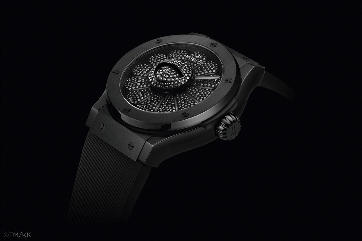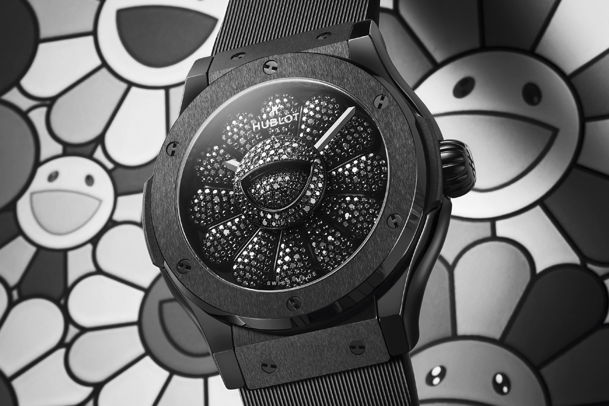 Completamente tempestato di diamanti neri, il fiore sorridente prende vita all’interno e sulla superficie dell’orologio. Grazie a un ingegneristico sistema di cuscinetti a sfera sviluppato dai tecnici di Hublot, i petali ruotano a 360° sul quadrante, mentre il cuore del fiore che ride, inserito sul vetro zaffiro, crea un effetto tridimensionale. È ormai tradizione per il brand svizzero avvalersi regolarmente di creativi di fama mondiale. Nel suo team di ambasciatori annovera, fra gli altri, Richard Orlinski, Shepard “Obey” Fairey, Marc Ferrero e Maxime Plescia-Büchi. E ora, appunto, anche Takashi Murakami.