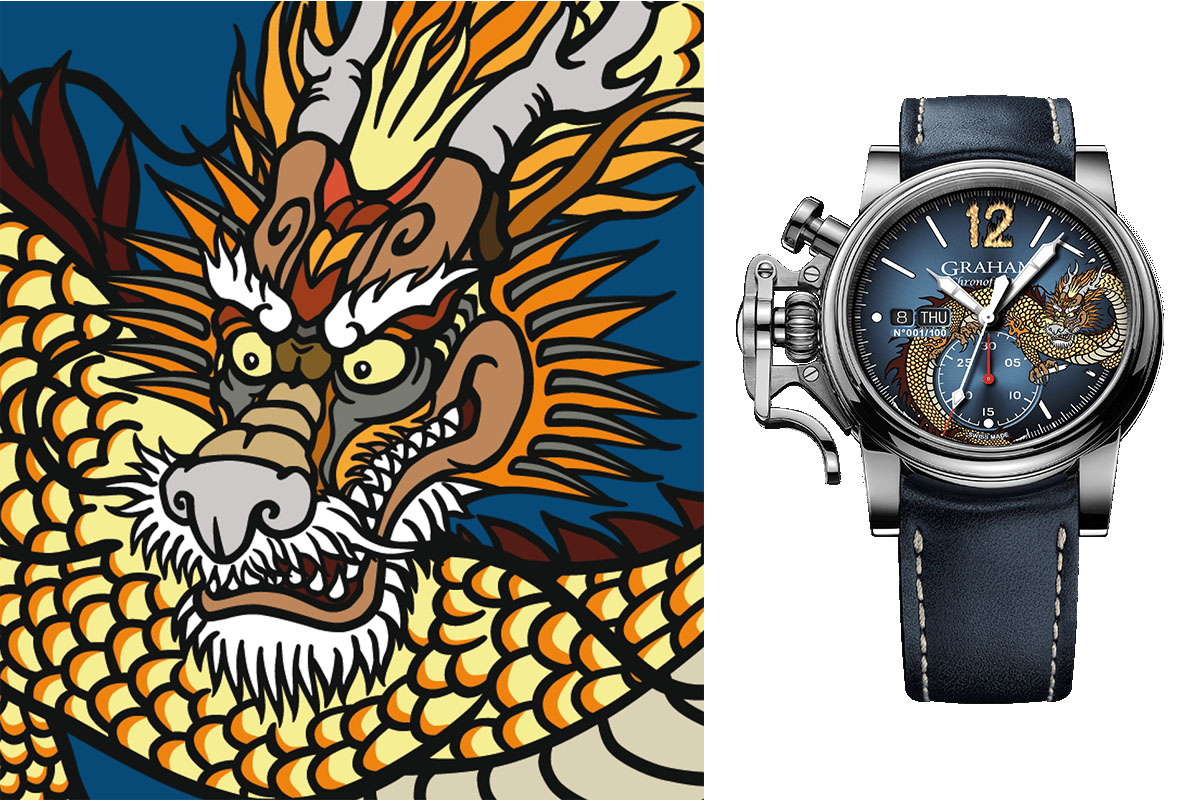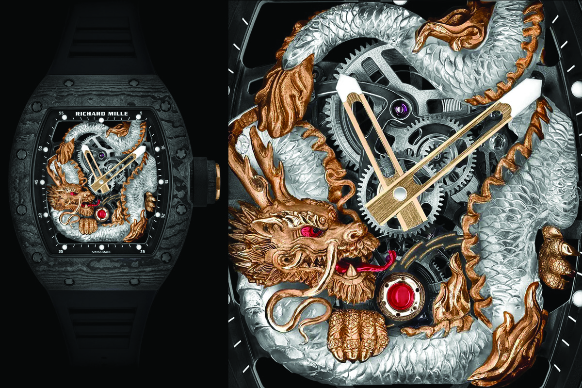 Del resto, i draghi in orologeria hanno proprio le sembianze attribuite loro dal folklore cinese: corpo di serpente, zampe di tigre, testa di coccodrillo, corna di cervo, criniera di leone, scaglie di carpa, baffi di pesce gatto. Con qualche variazione sul tema dovuta ai canoni dello zodiaco cinese, che vede nel drago l’unione degli altri segni e lo presenta come un mix di attributi tipici delle altre 11 bestie (baffi del topo, corna del bue, barba della capra e così via). E se la tradizione vuole che per riprodursi possano fecondare una perla, ecco che la gemma (spesso nera) ritorna anche negli orologi.