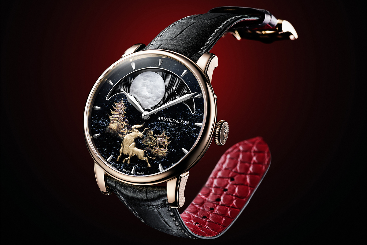 E poi c’è il Perpetual Moon di Arnold & Son, con fasi lunari ad alta precisione. Indicate da una luna in madreperla, con ombre dipinte a mano, che di notte si illumina (grazie al rivestimento in Superluminova) sopra al grande bove che si staglia a ore 6. Una scultura d’oro in miniatura su uno scenario di pagode a più piani, dipinto a mano con polvere d’oro.