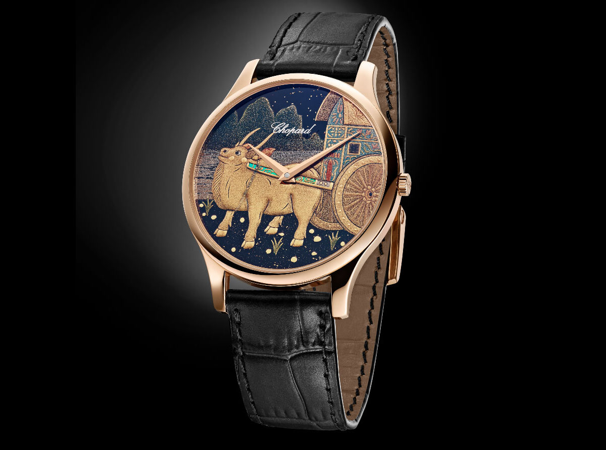 Comunque sia, l’anno del Bue è una buona occasione per lanciare nuovi esemplari. Occasione in cui, più che mai, l’orologeria mette in mostra il savoir-faire dei propri maestri incisori e smaltatori. Con tecniche molto complicate e talvolta antichissime. Come l’arte giapponese della lacca Urushi abbinata alla polvere d’oro secondo la lavorazione del Mak-i, realizzata per Chopard nei laboratori della secolare azienda Yamada Heiando dall’artista Minori Koizumi. Un minuzioso lavoro che ora, sul sottilissimo L.U.C XP Urushi Year of the Ox, riprende una scena bucolica di fatica ancestrale.