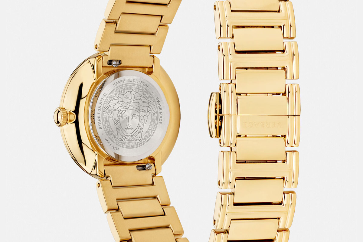 Il Versace Mini Virtus Duo è un esemplare ladylike, che si allaccia con un bracciale in acciaio dorato (Ip color champagne, per essere precisi), dalle superfici lucide. La fibbia a farfalla quasi invisibile lo fa somigliare più a un gioiello da polso che a un comune segnatempo. Ma il bello di questo bracciale sta nel fatto che è intercambiabile: bastano pochi attimi e gesti minimi per sostituirlo a piacere. Il Versace Mini Virtus Duo è infatti venduto in una confezione esclusiva, che comprende altri due cinturini di pelle (con fibbia ad ardiglione).