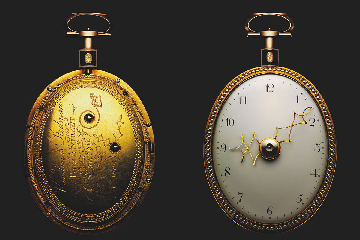 In quello stesso periodo, così fervido d’idee ma anche di scambi culturali, Vardon & Stedman, gioiellieri londinesi con sede in Bond Street, inventavano un orologio da tasca ovale con lancette per ore e minuti a pantografo (avete presente quelli sulle locomotive elettriche?). Cioè che si allungavano o si accorciavano per seguire il perimetro esterno della cassa. Il tutto comandato da una guida ovale, che riprendeva in piccolo la forma del quadrante; e da due ingranaggi sovrapposti, con i quali si poteva allargare o restringere l’angolo della lancetta. Ovviamente nell’orologio c’era un dispositivo per ciascuna lancetta.