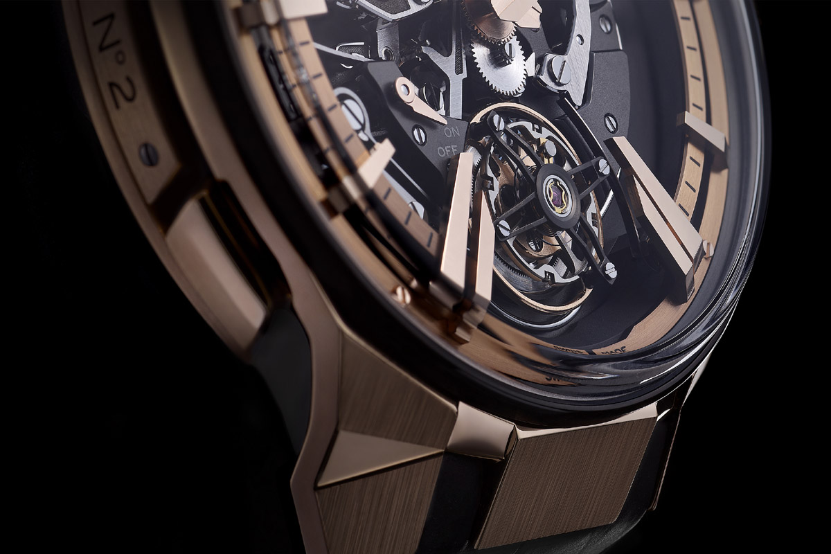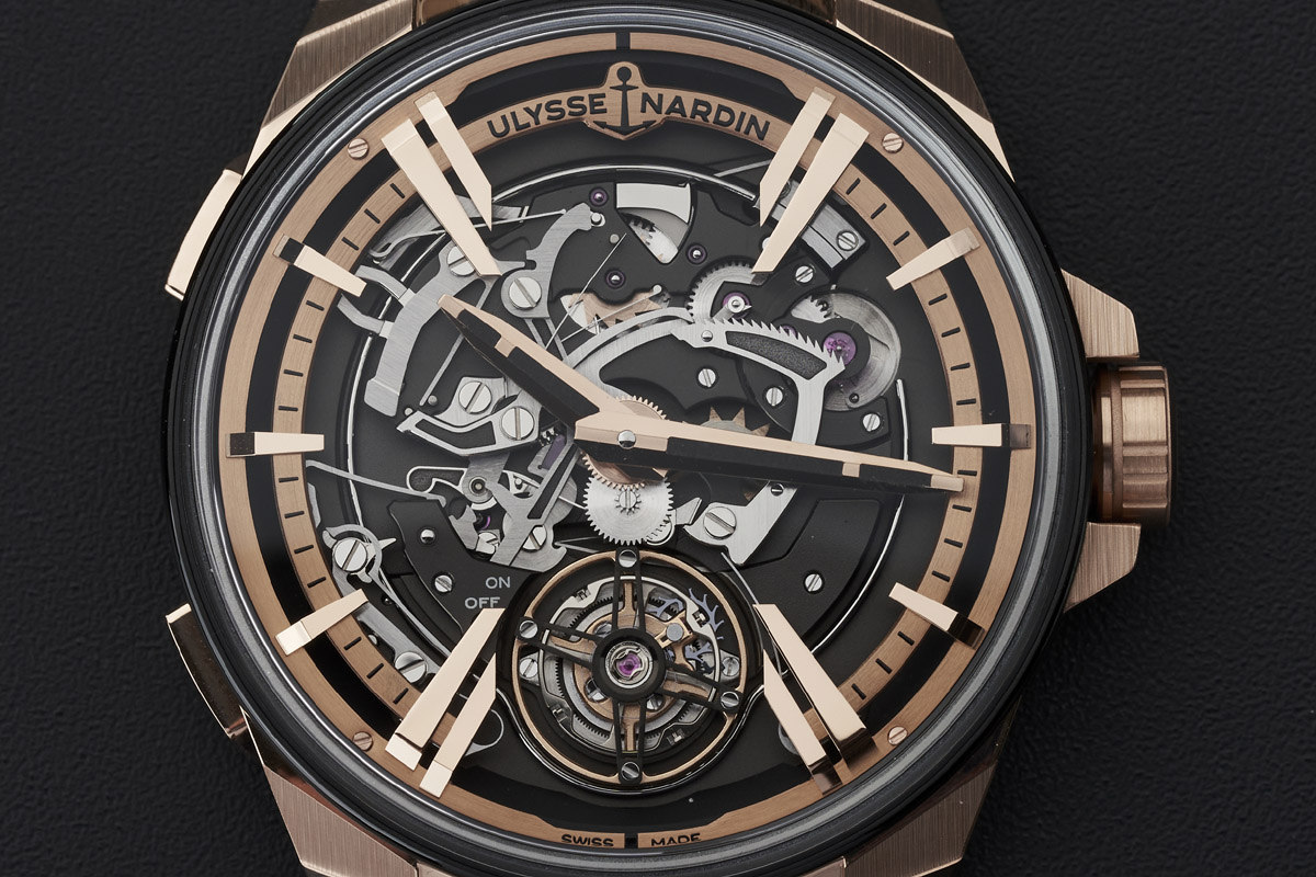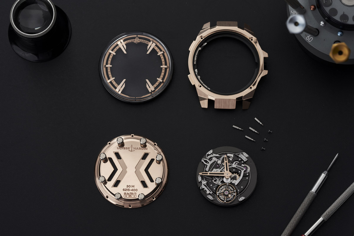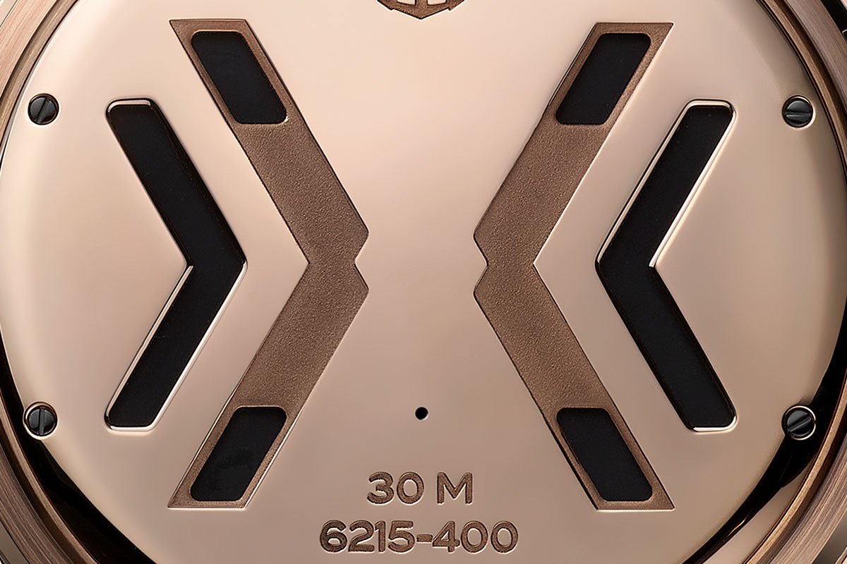 Realizzato in oro e fissato alla carrure – la parte mediana della cassa – per mezzo di 8 viti passanti, il fondello è traforato con un motivo a doppia X. Un omaggio alla collezione Blast e un pratico metodo per migliorare ulteriormente la resa acustica della membrana di Devialet con trattamento Dlc nero. Un unicum per la produzione manifatturiera di Ulysse Nardin.