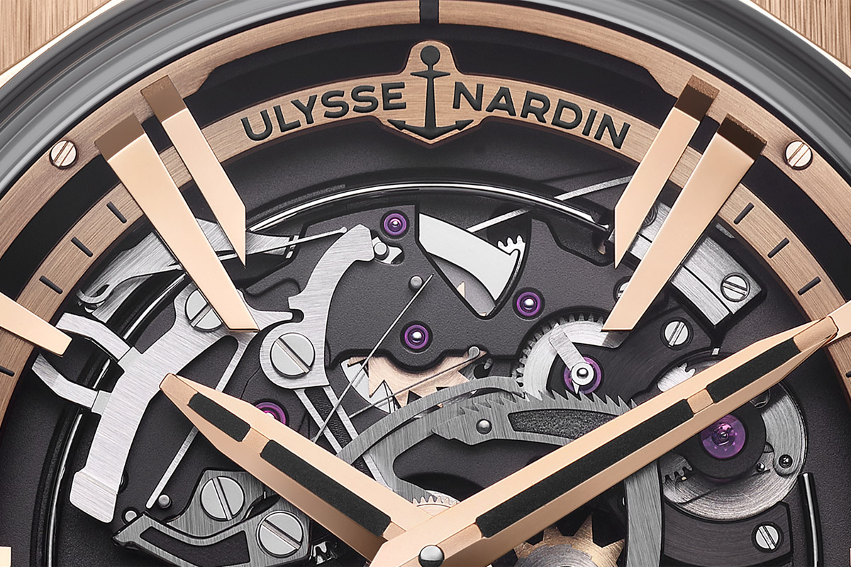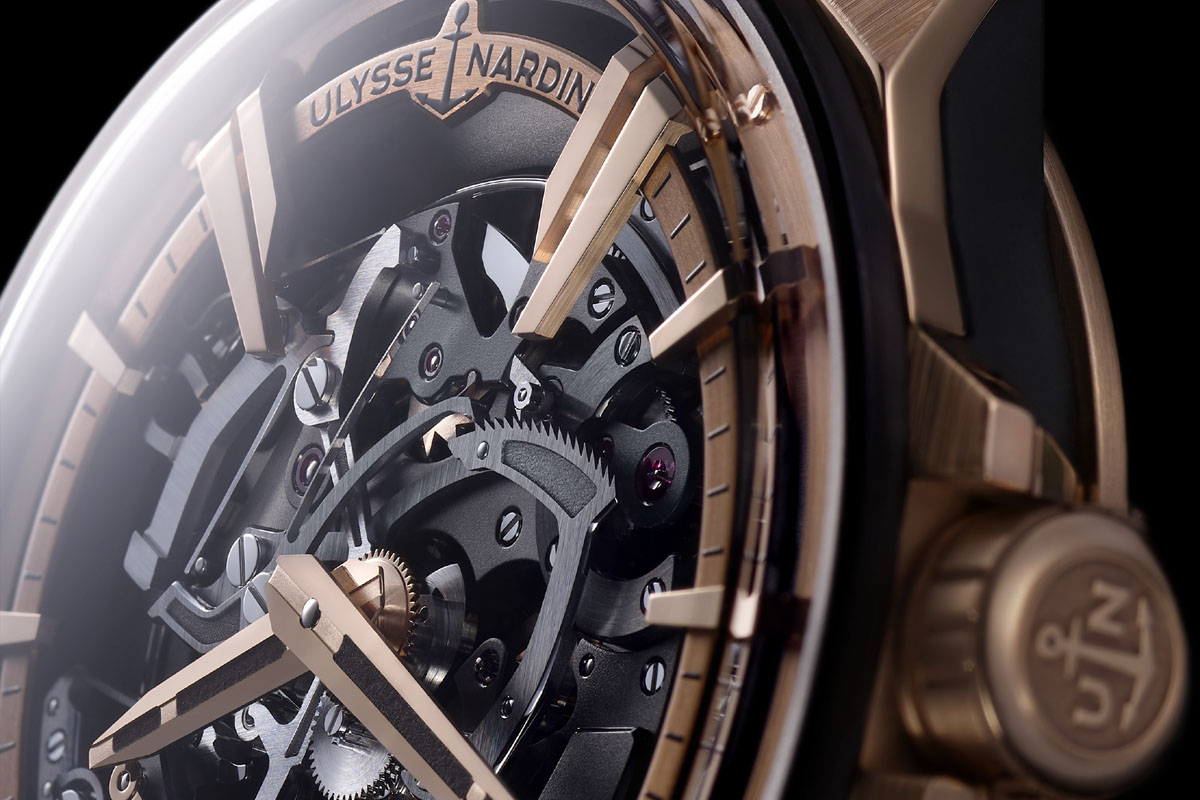 La gabbia infatti non è fissata alla platina da ponti superiori ma soltanto alla base, nella parte inferiore. All’interno ospita il bilanciere a inerzia variabile, ossia privo della racchetta di regolazione della lunghezza attiva della spirale. Che è realizzata in silicio, materiale ad alte prestazioni con il quale sono fabbricati anche la ruota di scappamento e l’ancora dell’organo distributore. Ulysse Nardin, va ricordato, è stata la prima in orologeria a utilizzare questo materiale totalmente antimagnetico. Costituito da 330 componenti, il movimento ha l’organo regolatore che oscilla a 28.800 alternanze orarie e dispone di un’autonomia di 60 ore.