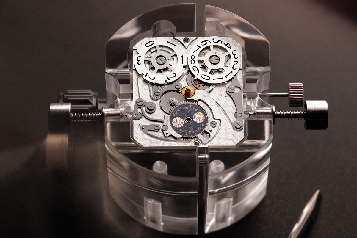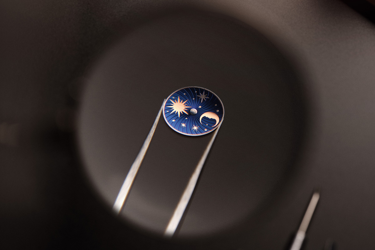 “In particolare, il cielo stellato che circonda la funzione giorno/notte: all’inizio volevamo farlo con un rivestimento elettrolitico per avere un blu speciale”, racconta ancora Lionel Favre. “Ma era difficile: la qualità raggiunta non ci soddisfaceva, l’applicazione del colore non era uniforme. Così abbiamo incaricato l’atelier Métiers Rares di trovare la soluzione. I nostri artigiani lo hanno quindi realizzato in lacca, a mano. Ora è molto bello, e ha una sfumatura particolare, leggermente diversa dal nostro design originario”.
