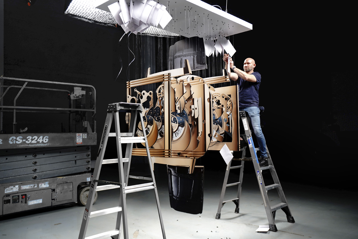 Un’ultima curiosità. Proprio in occasione del 90° anniversario, Jaeger-LeCoultre ha affidato un’interpretazione del Reverso Tribute Nonantième all’artista americano Michael Murphy. Il risultato è un’installazione sui generis, intitolata Spacetime. Mix di lavoro manuale, processi digitali e illusione ottica, è composta da una settantina di elementi di grandi dimensioni, che riproducono i dettagli fotostampati dell’orologio; ma che ne presentano l’esatta riproduzione solo quando sono osservati da determinate angolazioni. Negli altri punti di vista, invece, risulta un ammasso apparentemente disordinato di immagini.