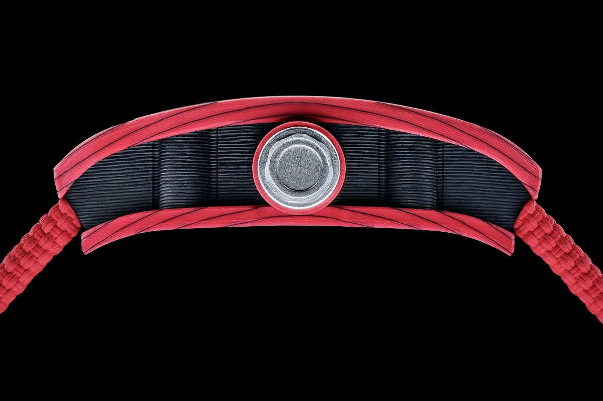 A onor del vero, va detto che la cassa dell’RM 07-01 Racing Red (così come le altre prodotte dal marchio nello stesso materiale) è composta da strati di Quarzo rosso Tpt intervallati da strati di Carbonio Tpt. La cui lavorazione è sostanzialmente simile a quella del quarzo, ma a partire da fibre di carbonio. Il motivo è che le fibre di carbonio Ntpt donano all’insieme una rigidità superiore, necessaria perché quelle del quarzo da sole sarebbero troppo flessibili. In più le fibre di Carbonio Tpt sono nere e forniscono anche un piacevole effetto estetico.