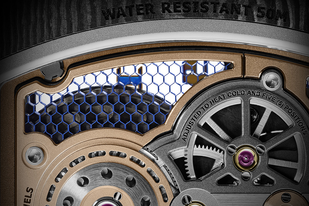 Insomma, tutti ambienti con temperature altissime, in cui la lega Haynes 214 – che ha il punto di fusione a 1400° C – fa valere il proprio basso coefficiente di dilatazione termica e la forte resistenza all’ossidazione da calore. Queste caratteristiche ne agevolano lo stampaggio convenzionale che, con il Richard Mille RM 21-01 Tourbillon Aerodyne, si traduce nella inedita platina a nido d’ape (eccola qui!).