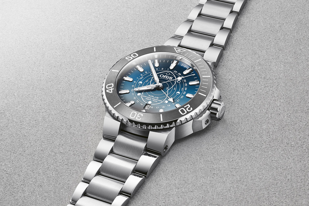 Progettata proprio per i subacquei professionisti è la funzione Pointer Moon, sviluppata in casa da Oris. Basata sul ciclo delle fasi lunari di 29,5 giorni, indica l’escursione delle maree nell’emisfero settentrionale. Basta guardare la lancetta centrale bianca che, una volta posizionata sulla data desiderata, visualizza anche il livello corrispondente della marea riportato sull’apposito profilo sul quadrante. In più, la stessa lancetta indica ovviamente le fasi di Luna.