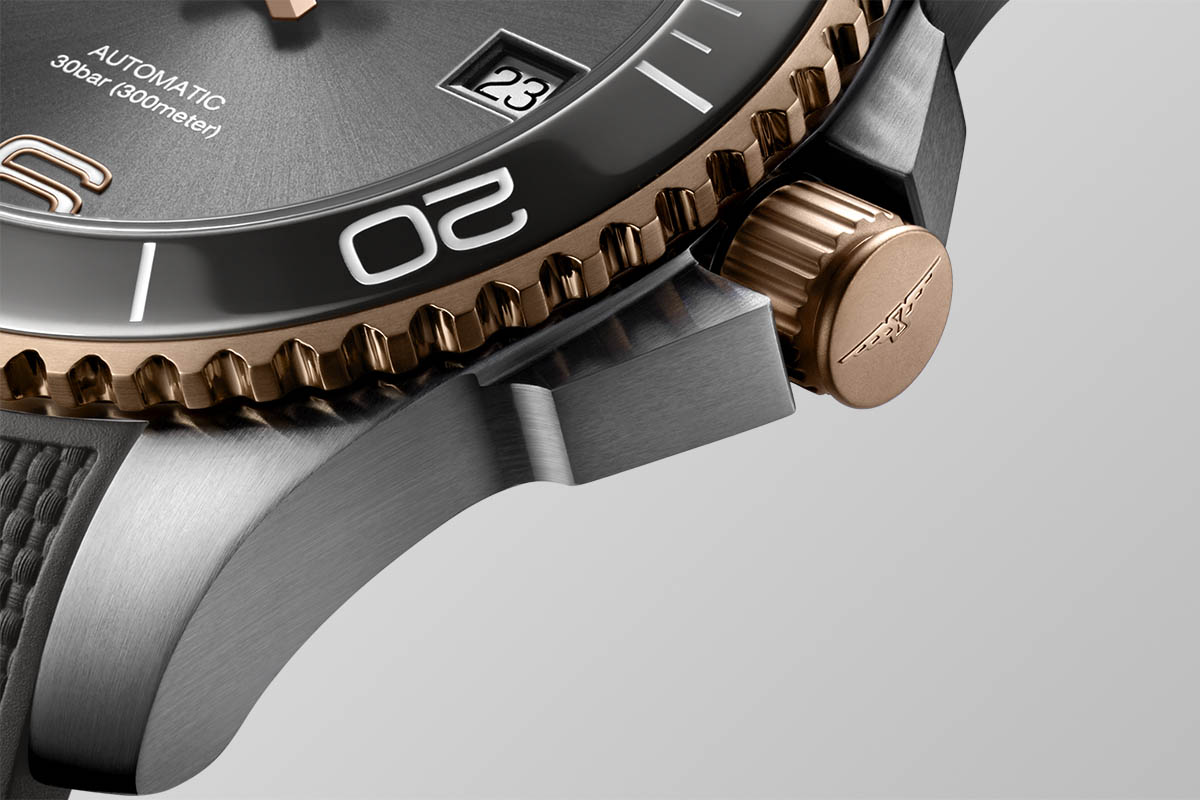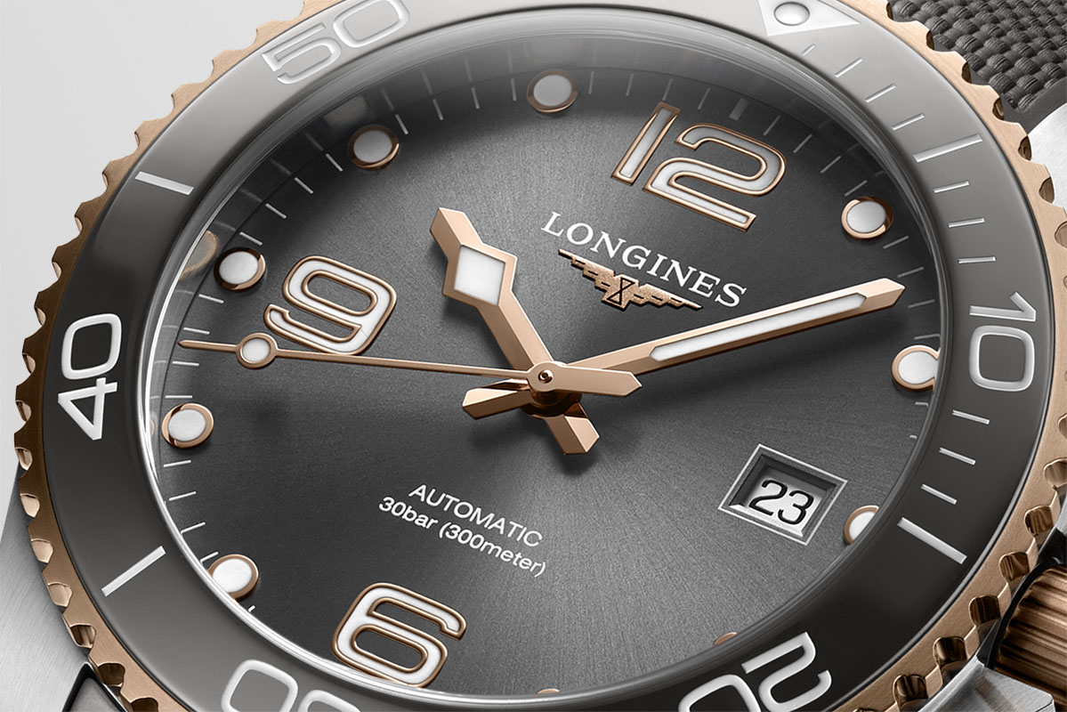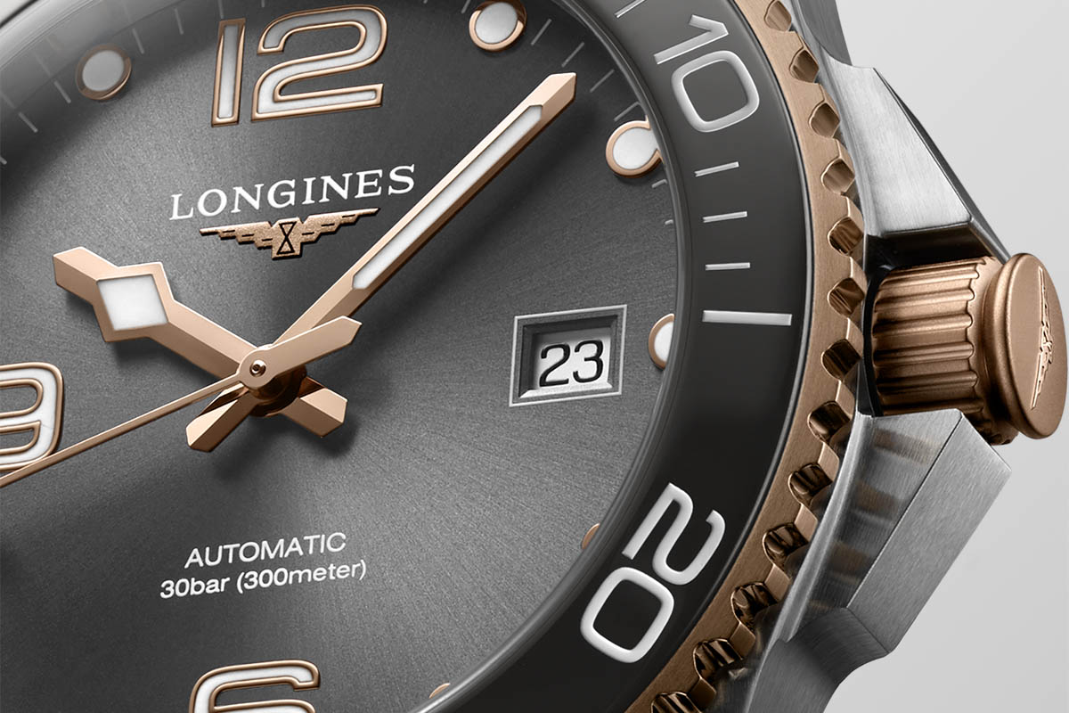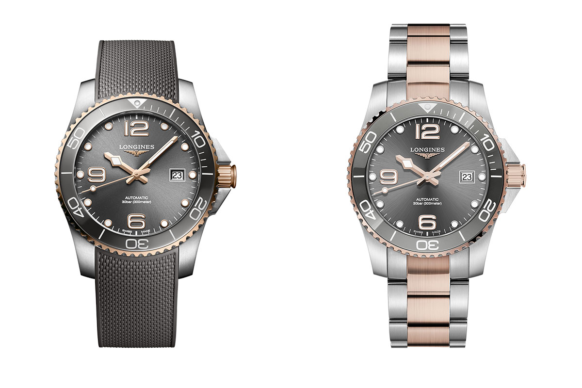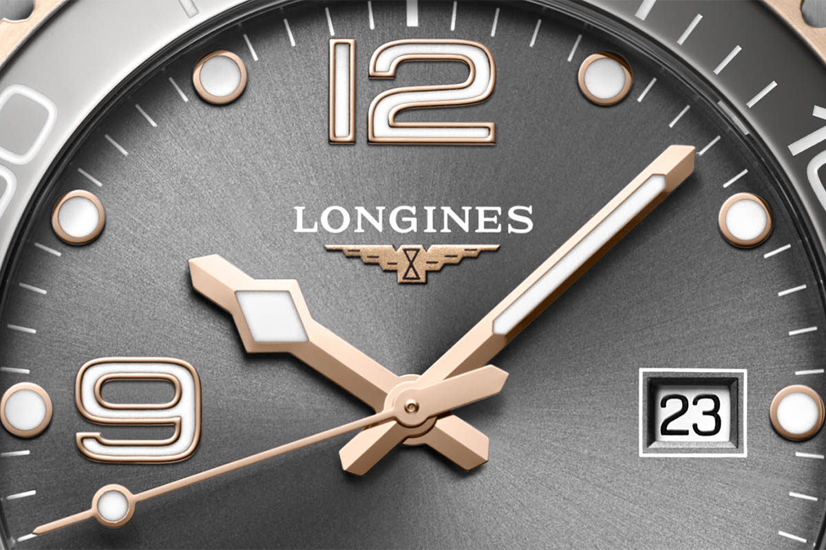 Di recente, comunque, Longines ha ampliato la collezione con nuove varianti bicolore, in acciaio e Pvd oro giallo oppure Pvd oro rosa, declinate in grigio, blu, nero o verde. Io ho scelto di scrivere della versione acciaio/Pvd oro rosa con quadrante e lunetta grigi. Perché mi sembra la più versatile: lo stile sport-chic la rende adatta tanto alle immersioni quanto ai look “da città”. È discreta quanto basta, però è originale, non banale: proprio per il colore insolito, che non è un “normale” classicone ma non concede nulla neppure ai trend più modaioli.