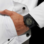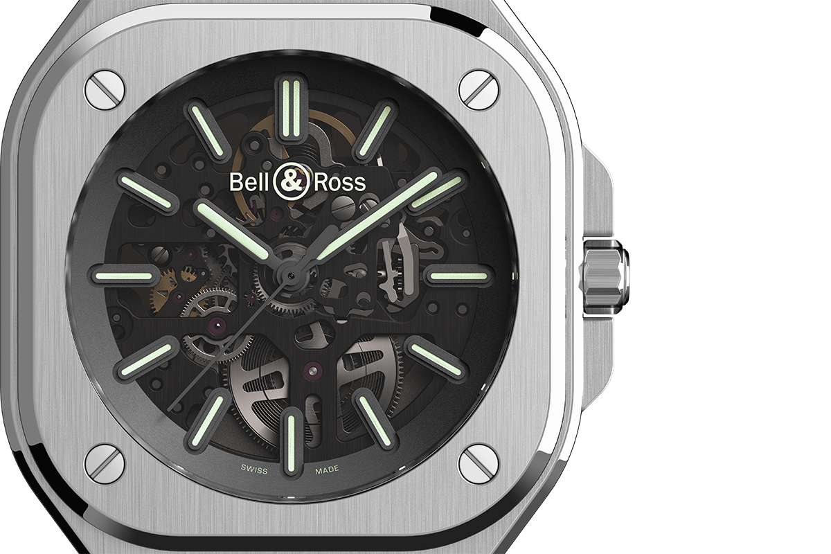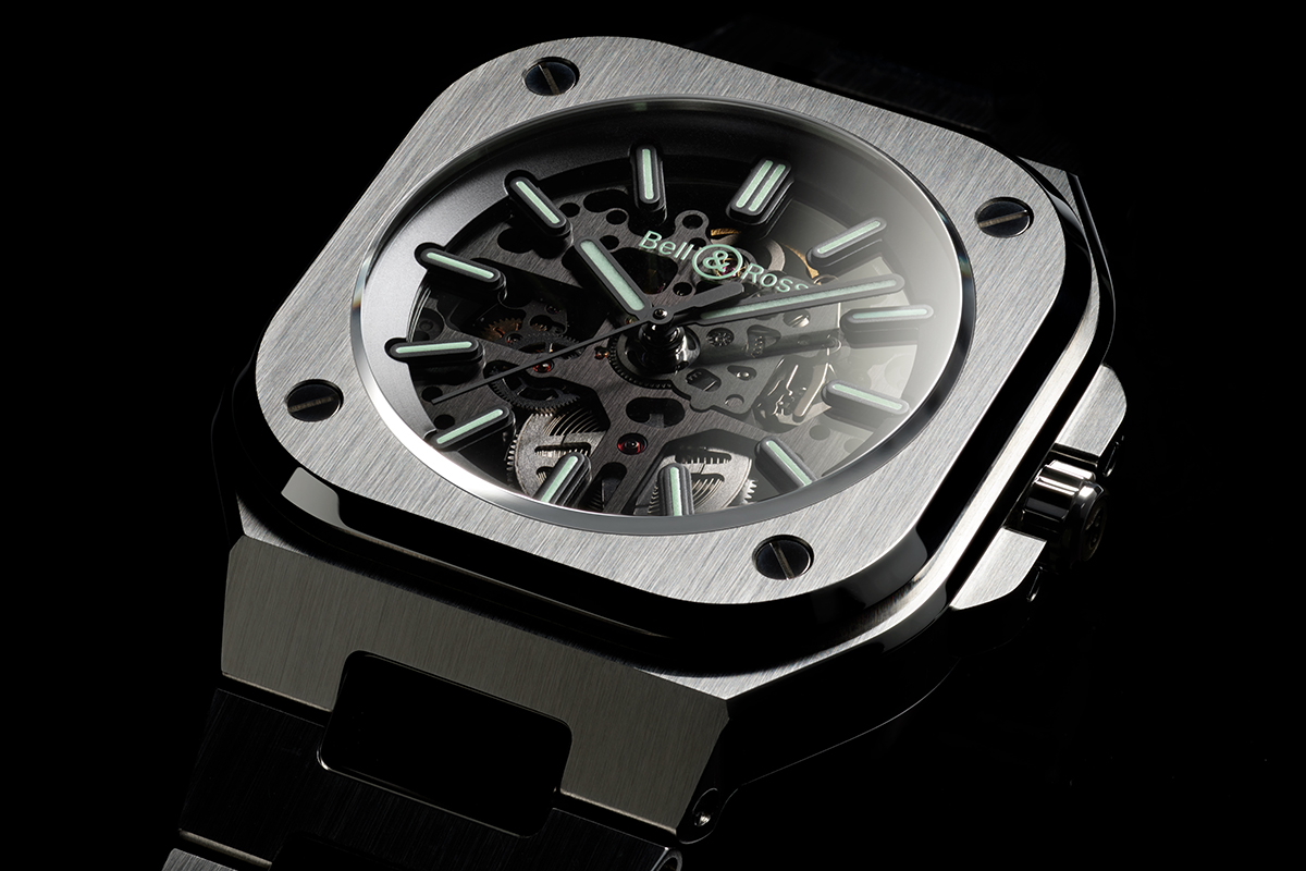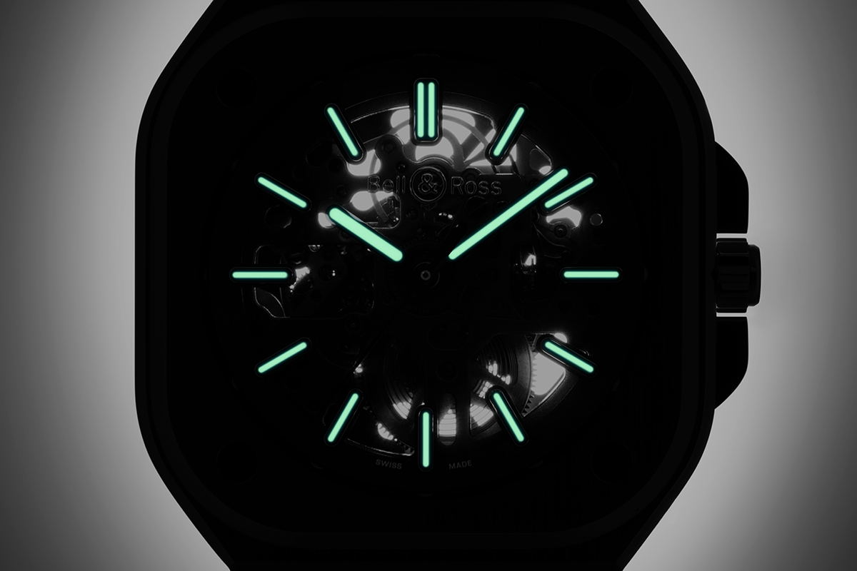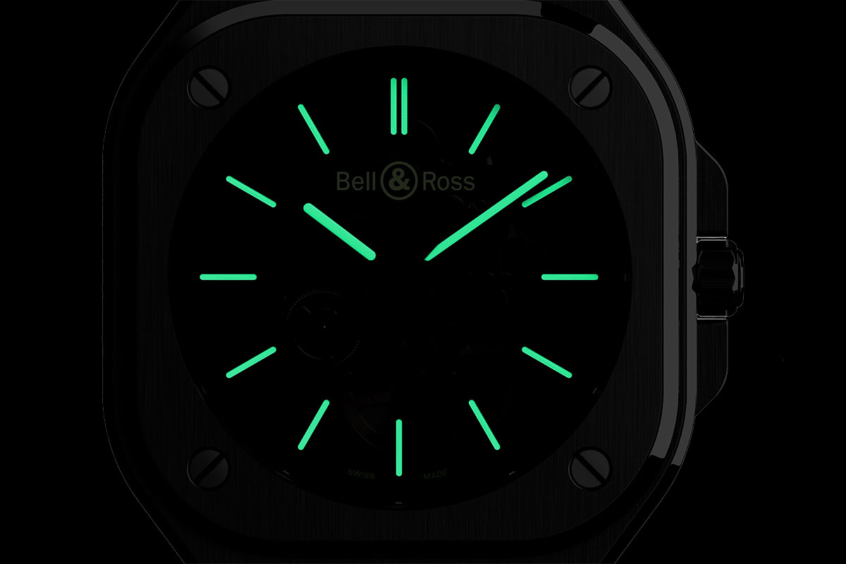 Il movimento BR-CAL.322, meccanico a carica automatica, viene sviluppato sulla base del Sellita SW300-1. Sellita, in continua crescita sia qualitativa che quantitativa, fornisce il movimento di base ad una discreta quantità di marchi, fra cui la stessa Bell & Ross. Che però, in questo caso, ha chiesto di sviluppare in esclusiva un movimento scheletrato. Si tratta di una scheletratura “industriale”, sia ben chiaro, altrimenti il prezzo (il BR 05 Skeleton Nightlum costa 5.900 euro nella versione con cinturino in caucciù e 6.400 con bracciale d’acciaio) sarebbe ben più alto.