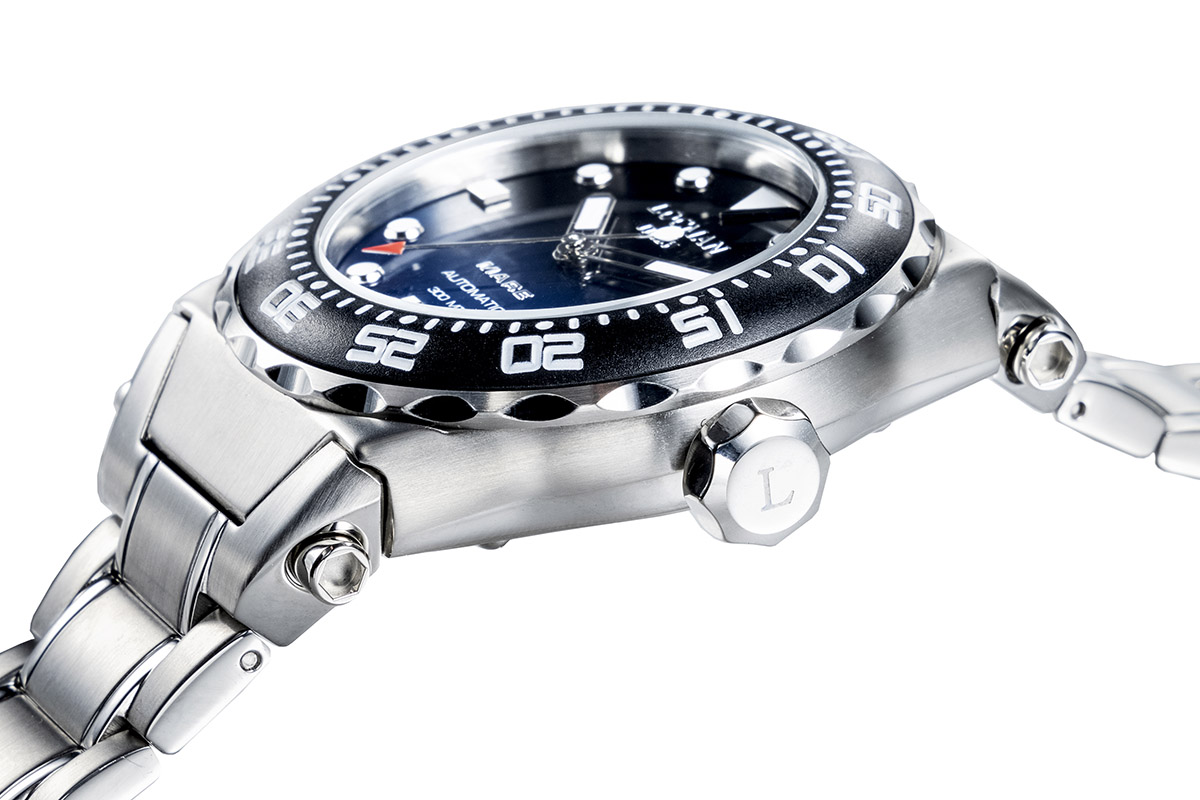 Il nome stesso già la dice lunga sulla vocazione dell’orologio. Ma il primo colpo d’occhio non lascia spazio a dubbi e ci trasporta direttamente a esplorare le profondità marine. Il disegno della cassa, il quadrante, il bracciale sono tutti elementi che ne svelano l’anima sportiva e subacquea. Un piacere per la vista che diventa poi fisico nel momento in cui si indossa al polso il Locman Mare 300 metri. Nonostante le dimensioni importanti della cassa (44 mm di diametro), realizzata in acciaio AISI 316L e titanio, l’orologio si adatta bene al polso e rivela un’ottima ergonomia.