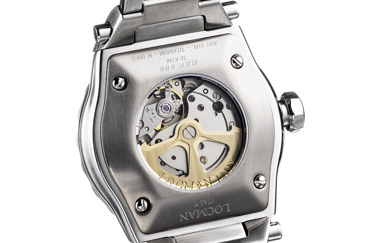 Abbiamo già scritto altrove della versione cronografo al quarzo. Qui ci concentriamo allora sui nuovi solo tempo, animati da un movimento meccanico a carica automatica. In questo caso lo sforzo tecnico è andato nella direzione di utilizzare un fondello a vista in titanio serrato con quattro viti, grazie al quale è possibile cogliere alcuni elementi del movimento, come la massa oscillante traforata. Un dettaglio non di poco conto, perché mette in luce la portata delle capacità tecniche e ingegneristiche di Locman in virtù dell’impermeabilità garantita fino a 300 metri di profondità.