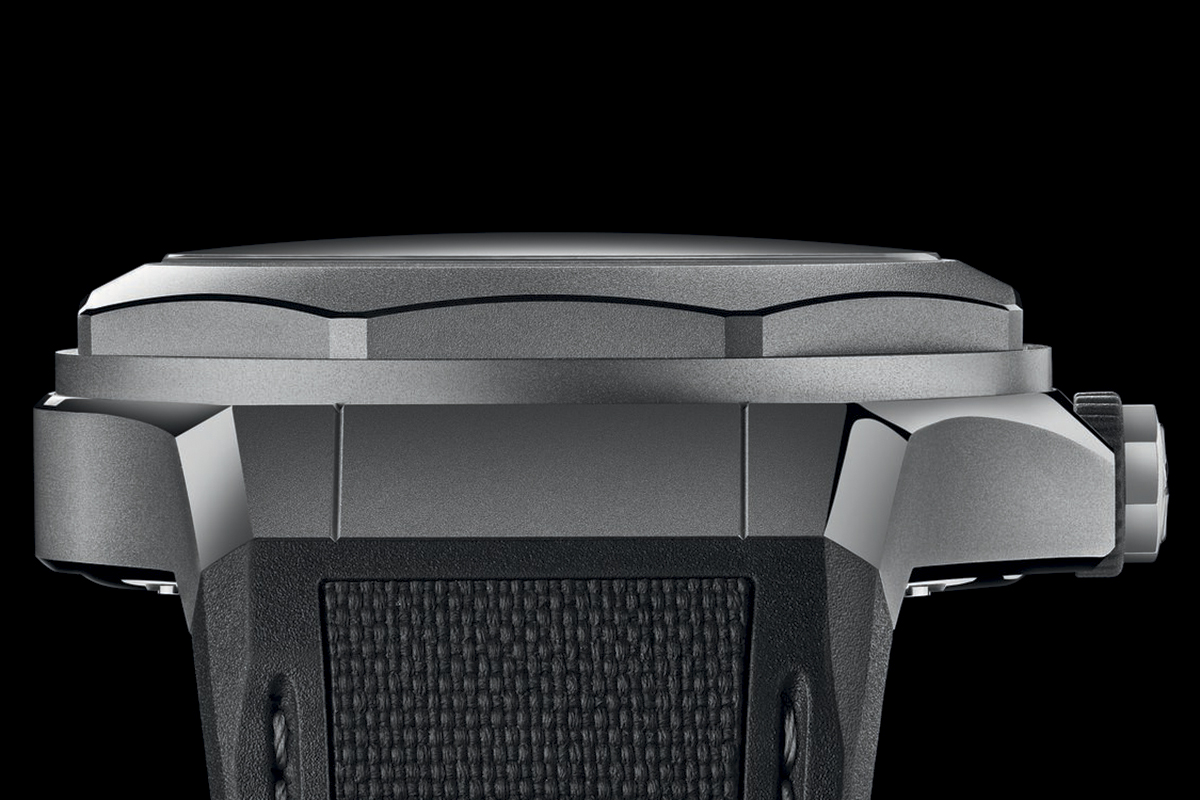 La parte risolta brillantemente dal disegnatore è la lunetta. Gli spigoli arrotondati sembrano riprendere il design di un precedente modello con cassa in fibra di carbonio. Ma il taglio degli spigoli è ancora più accentuato e diminuisce, modernizzandolo, l’effetto “bullone ottagonale” che pure era stato alla base del successo del Laureato, nel 1975. Ottagonale anche la corona, la cui gestione è però facilitata da un anello in materiale sintetico.