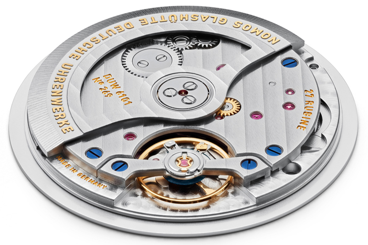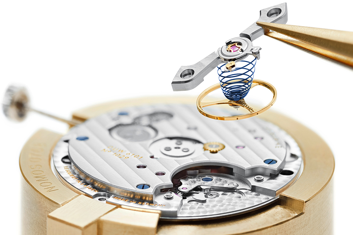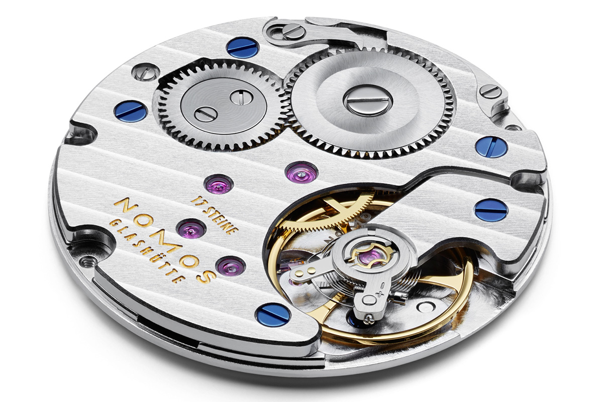 Beh, in realtà Nomos Glashütte arriva a realizzare circa il 95 per cento dei propri movimenti a Glashütte, quasi raddoppiando il minimo richiesto. Nelle foto si nota l’antiurto sulla pietra di controperno del bilanciere, ma è probabile che altre parti dell’organo regolatore provengano dalla Svizzera. Il che non è un male: tutt’altro. Non lo scappamento, comunque, che è progettato e realizzato “in casa”.