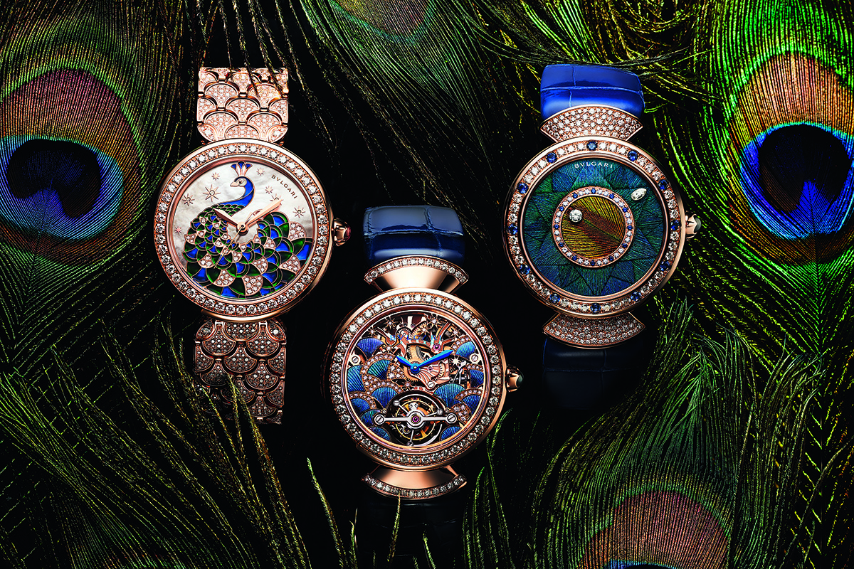 Cassa (38 mm) in oro bianco. Movimento al quarzo Swiss made. Quadrante in madreperla, pavone in oro bianco scolpito a mano con zaffiri blu di varie sfumature, diamanti e calcedonio, doppia lunetta con diamanti e zaffiri, vetro zaffiro, cinturino in satin. 81.950 euro.