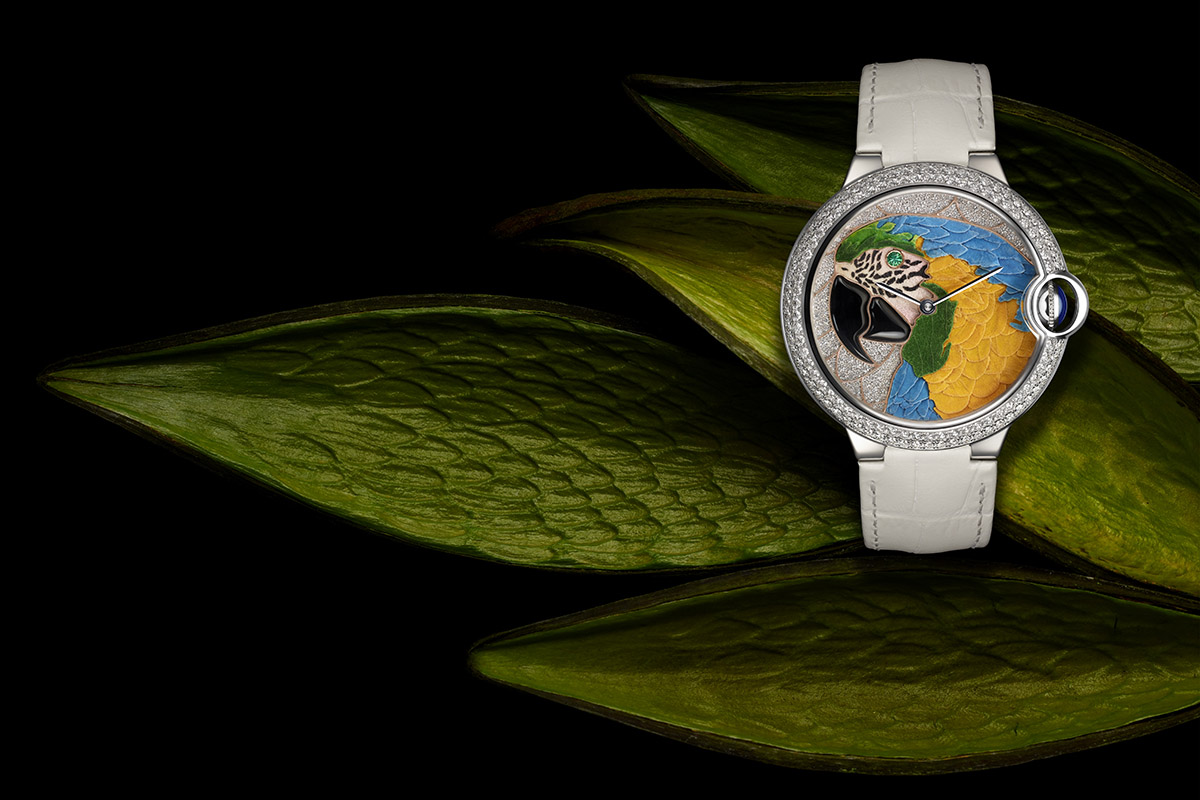 Certo, gli smalti (di tutti i tipi, compresa la pittura in miniatura) sono fra i metodi artistici più usati per immortalare piumaggi screziati o colorati. Ma non sono i soli. Le case di orologeria mettono in atto una serie di pratiche ingegnose per realizzare bird watch più o meno realistici (piuttosto che astratti). Incisione (in senso lato), scultura in 3D, incastonatura di pietre preziose, ma anche tarsie di legno o di piume, mosaico di vetro o di pietre dure, ricami con fili di seta… chi più ne ha più ne metta. Memorabile resta il pappagallo eseguito qualche anno fa per Cartier, fatto con una speciale marqueterie di petali di rose.