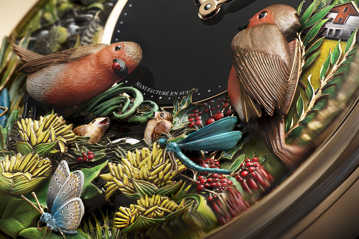 Cassa (47 mm) in oro rosso. Movimento meccanico a carica manuale, di manifattura, con ripetizione minuti e automi (animazione degli uccelli, della schiusa dell’uovo e del fiume), indicazione decentrata di ore e minuti. Quadrante in oro rosso e madreperla, inciso e dipinto a mano (la cascina a destra sullo sfondo è l’esatta riproduzione di quella in cui nacque Pierre Jaquet Droz nel 1721), con pettirossi in oro scolpito e dipinto a mano, inserto in onice nera; vetro zaffiro anche sul fondello, cinturino in pelle di alligatore. Edizione limitata di 8 esemplari. Prezzo non disponibile.