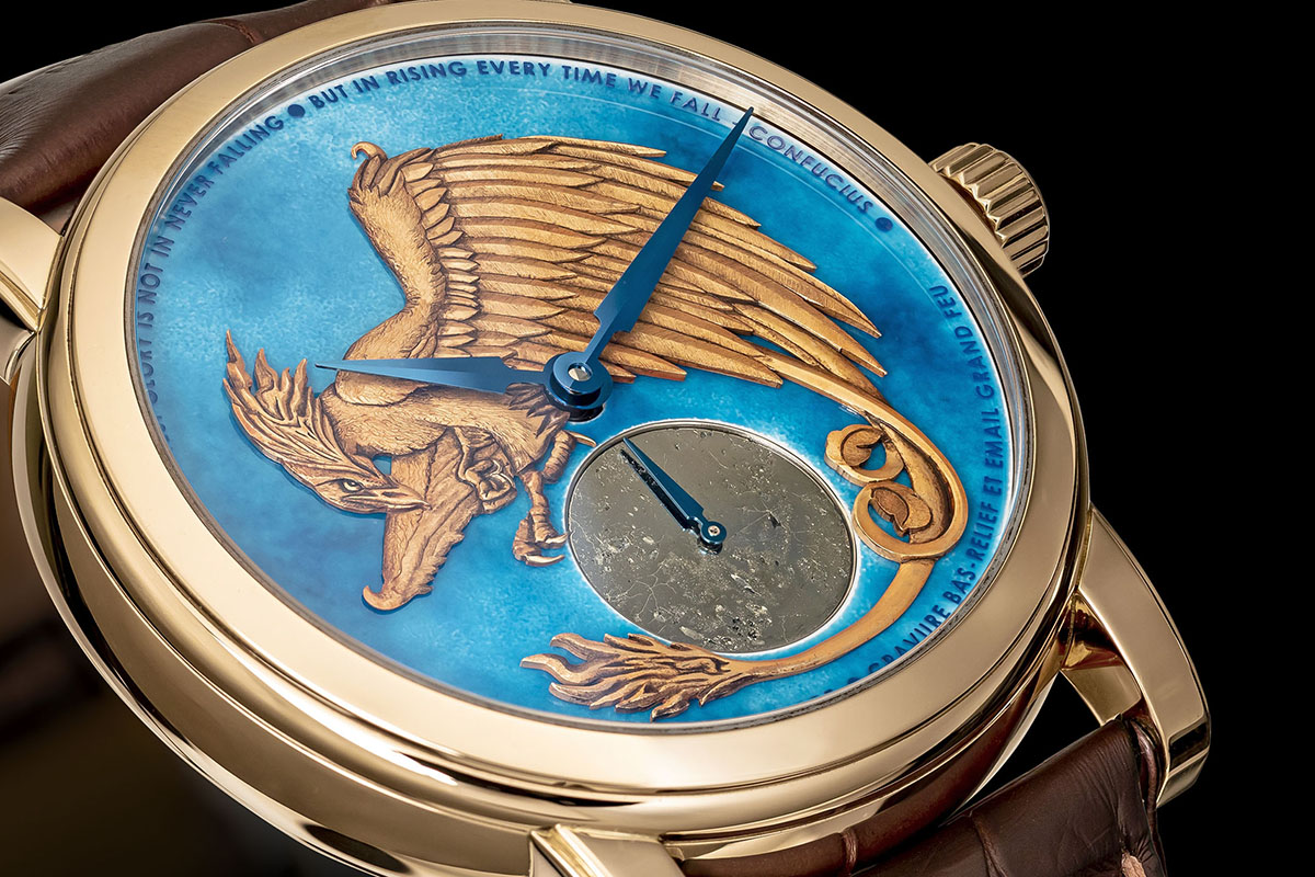 Cassa (39 mm) in oro rosso. Movimento meccanico a carica automatica, di manifattura, con autonomia di 86 ore, micro-rotore decentrato e piccoli secondi. Quadrante in oro, realizzato in collaborazione con Les Ateliers Blandeniers, con fenice in oro inciso e dipinto a mano, cielo in smalto e contatore in pirite; lancette in acciaio azzurrato alla fiamma, vetro zaffiro anche sul fondello, cinturino in pelle di alligatore. Pezzo unico. Prezzo non disponibile.