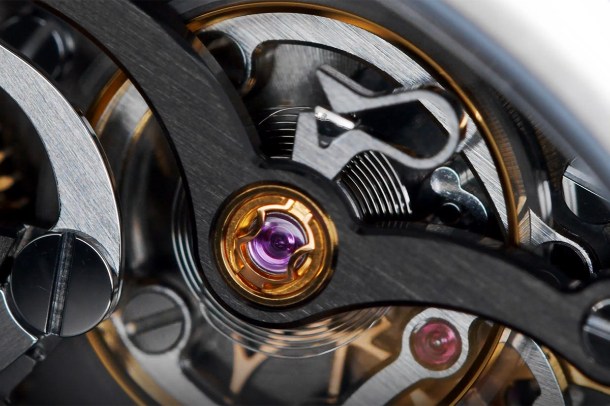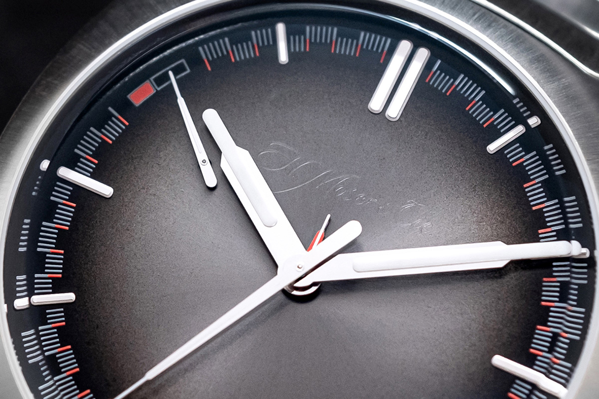 Laddove però ci si aspetterebbe un po’ di affollamento, ci si trova invece dinnanzi a tanto spazio lasciato volutamente libero, quasi si fosse al cospetto (senza nulla togliere) di un solo tempo. Poi però ci si avvicina, si aguzza la vista e si inizia a comprendere che “là sotto” batte un cuore ben più complicato di ciò che appare. Al centro le lancette di ore e minuti, composte da due parti, dall’estremità allungata e tridimensionali, sono ben visibili anche al buio grazie agli inserti in Globolight®, materiale a base ceramica contenente Super-LumiNova®. Infulcrata al centro anche la lancetta dei secondi, che percorre una minuteria in cui si alternano bianco e rosso.