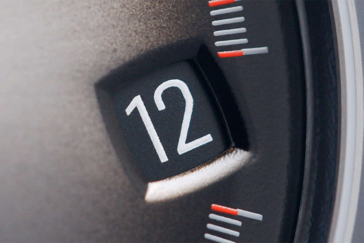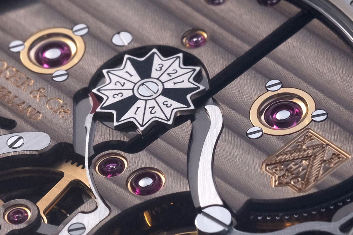 A ore 10, riprende la colorazione della minuteria anche l’indicazione della riserva di marcia, testimone della notevole autonomia di questo calibro a carica manuale: ben 7 giorni (168 ore). Quasi nascosta, ma ben visibile soprattutto quando scocca la mezzanotte dell’ultimo giorno del mese, una piccola lancetta è pronta a scattare per mostrarci il cambio della data. La domanda che sorge spontanea è: ma l’indicazione del mese dov’è? La soluzione è tanto minimalista quanto geniale… 12 ore = 12 indici, un mese per ogni indice. E il gioco è fatto.