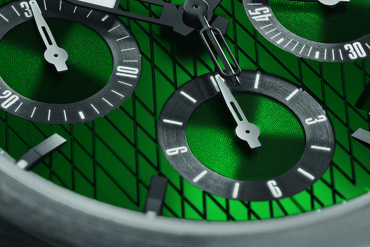 Come questo “quadrante verde”, in realtà ottenuto applicando tre mani di vernice (lasciando a ciascuna il tempo di asciugarsi prima di stendere la successiva) realizzando uno strato che viene poi cotto in forno. Tutto qui? Naaah! Perché gli strati sono ben sette, per ventun mani di vernice, nel complesso. Il risultato? Trasparenza e brillantezza quasi magiche. È una tecnica in gran voga nelle auto di qualità superiore. Per intenderci, una roba da sommelier del colore che arriva a costare, da sola, quanto una buona automobile con una buona verniciatura.