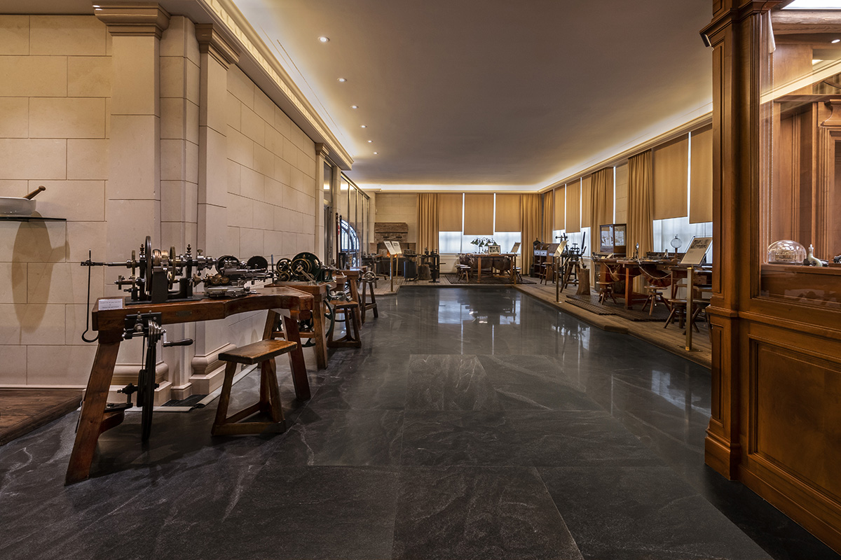 Il Patek Philippe Museum si sviluppa su quattro livelli. Al piano terra sono esposti vecchi banchi da lavoro da orologeria e gioielleria, attrezzi e macchine d’epoca – dal XVIII alla metà del XX secolo. Dietro una vetrata, è inoltre allestito un grande laboratorio d’antan – simile a quelli in cui lavoravano i celebri “cabinotiers” ginevrini – specializzato nel restauro degli orologi in esposizione. Ma il corpus della raccolta si trova ai piani superiori. Partiamo quindi dall’alto, in una sorta di visita immaginaria che ne sveli i principali tesori.
