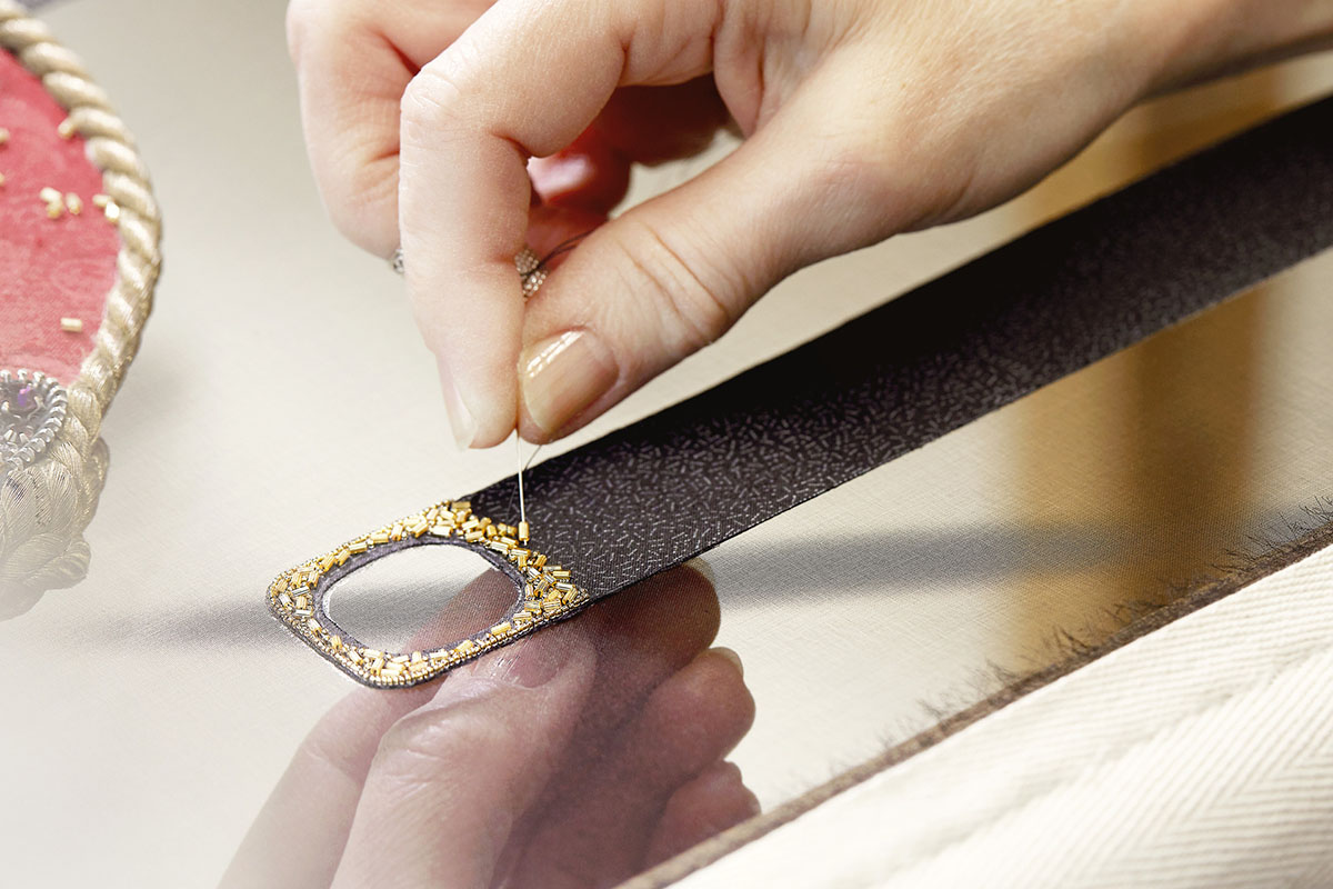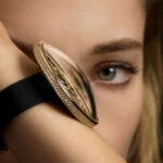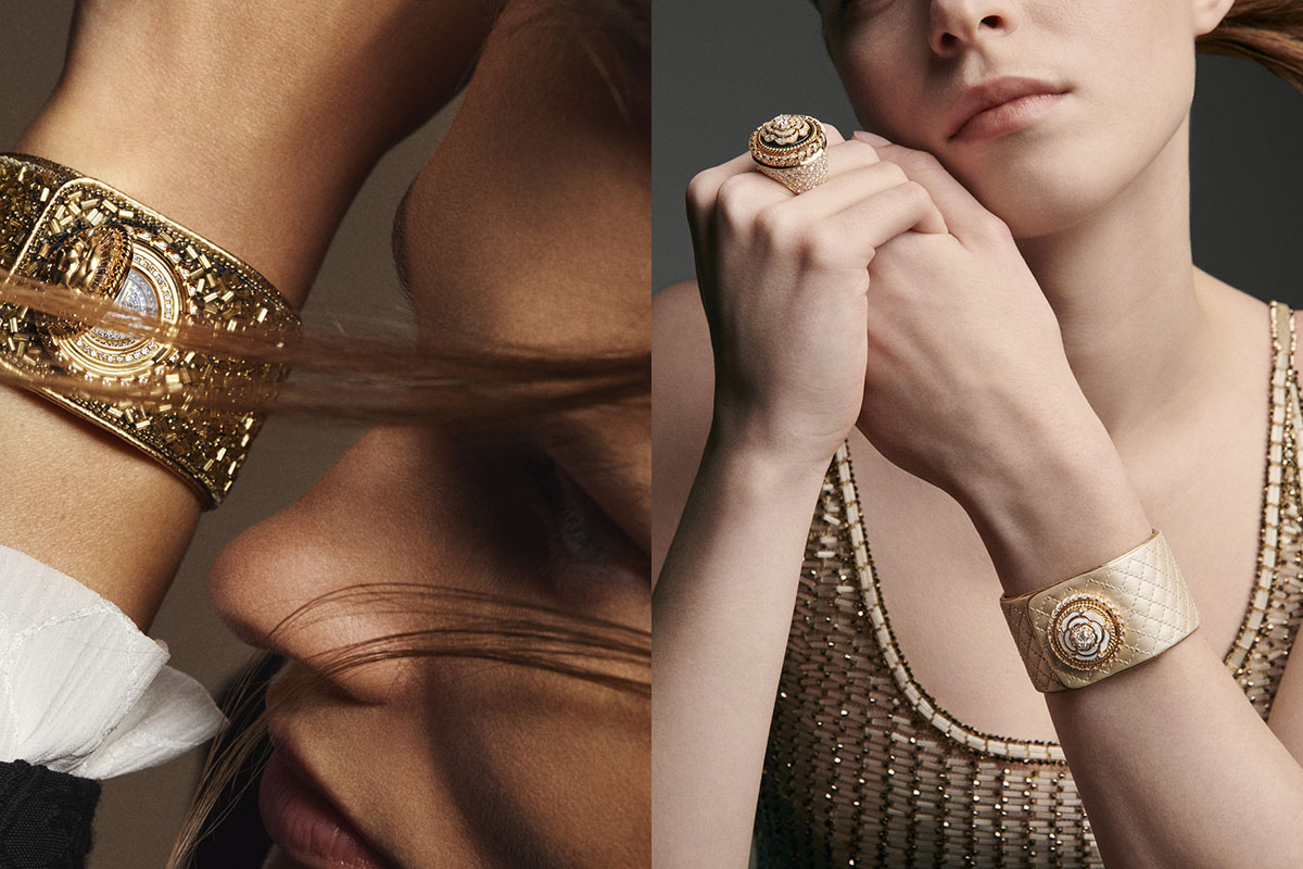 Gli stessi soggetti ritornano poi negli altri esemplari “à manchette” della collezione Mademoiselle Privé Bouton. Tre alti polsini di pelle matelassé in una palette cromatica tipicamente Chanel: champagne (o, meglio, mordoré), rosso e nero. Cui si aggiunge un altro modello in organza di seta completamente rivestita di perline dorate – applicate a mano una ad una dalle esperte ricamatrici della Maison Lesage – e foderata di pelle nera. Come dicevo, i bottoni che nascondono l’orologio sono impreziositi da diversi motivi: la camelia con la corolla di madreperla e diamanti; l’effigie di Gabrielle Chanel o la testa di leone scolpite nell’oro giallo; il decoro bizantino incastonato di gemme di colore.