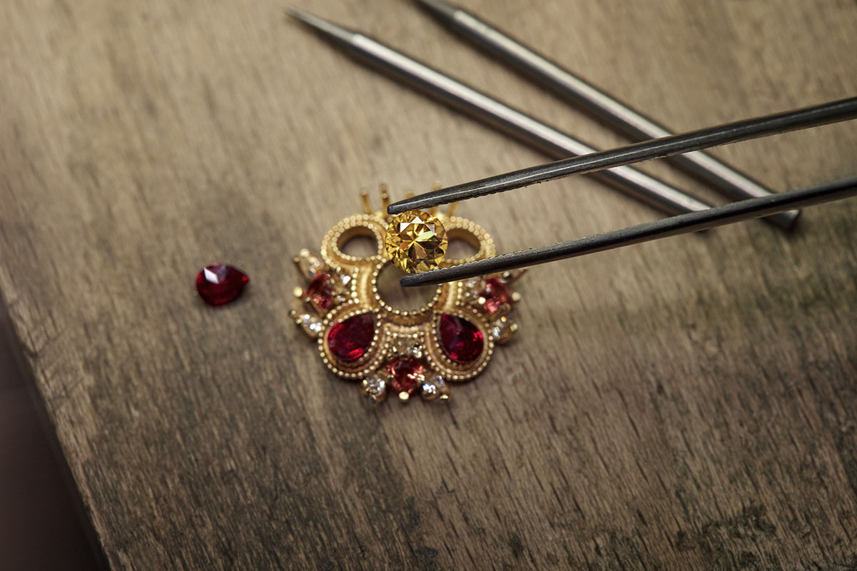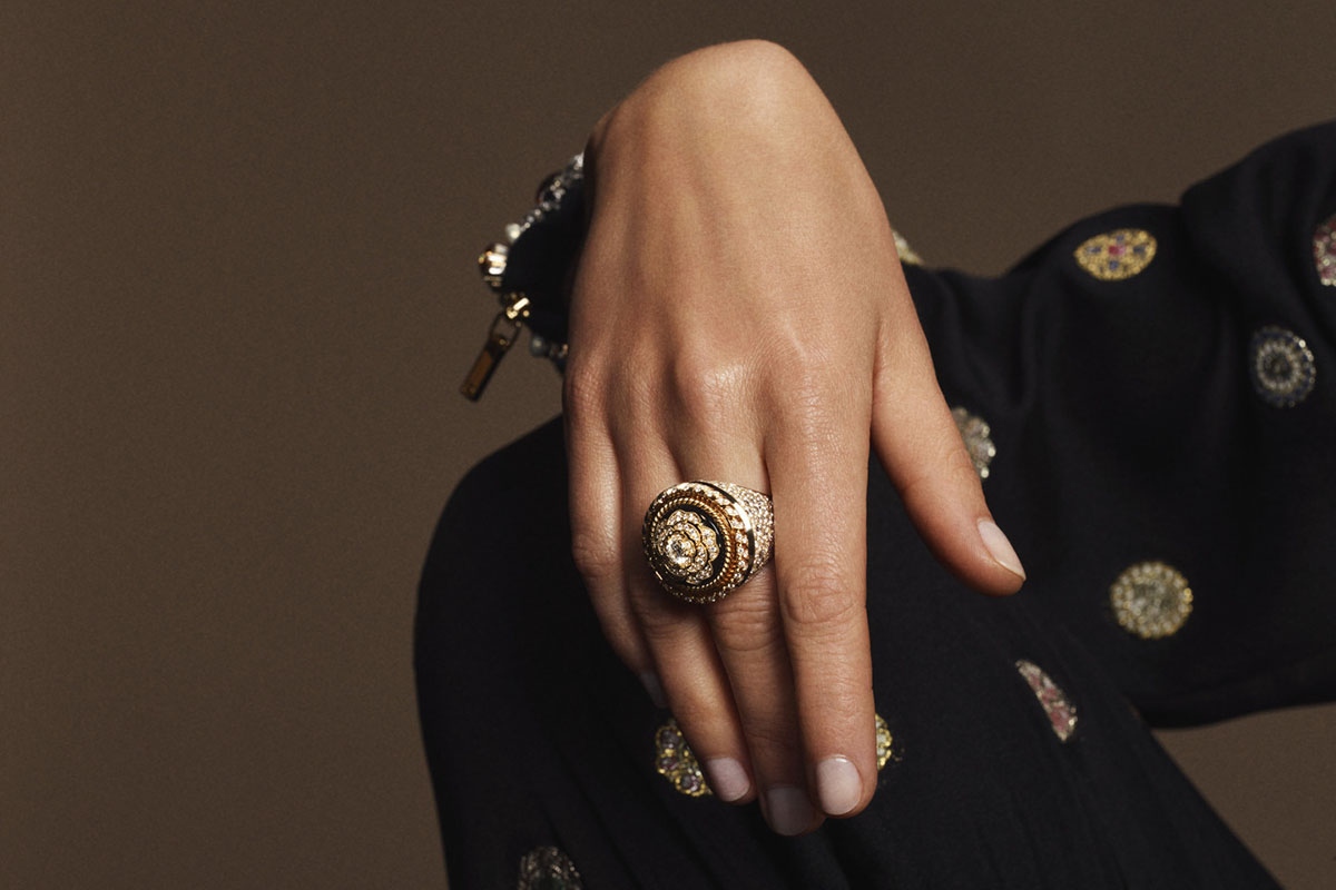 Nel Mademoiselle Privé Bouton bague Décor Byzantin, infine, ciascuna pietra è tagliata su misura in modo da corrispondere con precisione al design del Creation Studio di Chanel. Il bottone è ornato infatti con cinque diamanti taglio cuscino (quello centrale da 1.50 ct), quattro diamanti taglio a goccia e otto taglio rotondo, tutti incastonati a griffe; cui si aggiungono il full pavé del quadrante e il gambo incastonato “a neve”, per un totale di 10.87 carati.