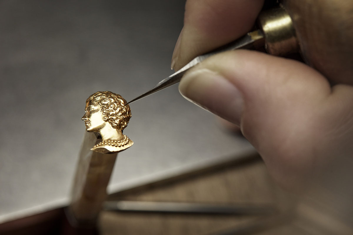 Per il cammeo del Mademoiselle Privé Bouton bague Camée, invece, il maestro incisore ha lavorato per un mese intero: prima per riprodurre il profilo di Mademoiselle su un modello più grande, in scala 1:7, così da studiare nei particolari l’espressione del volto, e poi per riportarlo esattamente nell’agata niccolo (un tipo di calcedonio). In questo caso i diamanti totali – limitati (si fa per dire) al quadrante, al bordo del bottone e al gambo dell’anello – raggiungono i 6.38 carati.