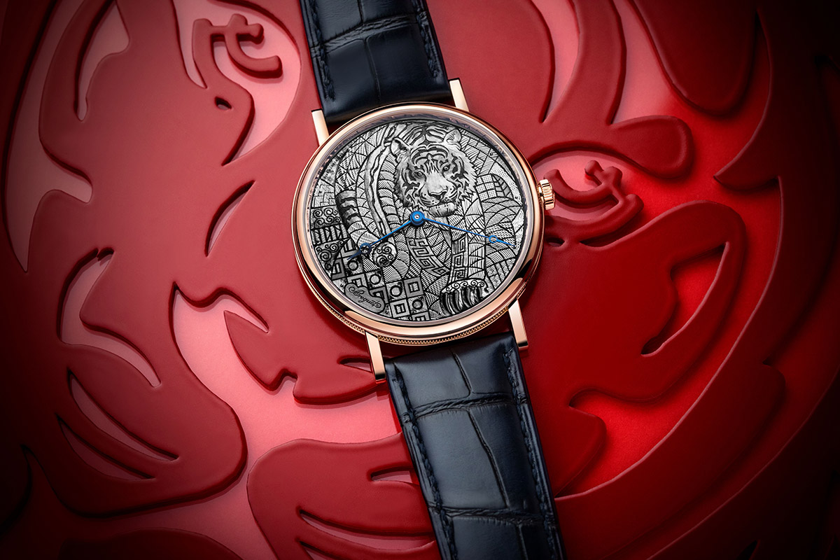 BREGUET Classique 7145 Anno della Tigre Cassa (40 mm) in oro rosa. Movimento meccanico ultrapiatto a carica automatica, calibro 502.3 (2,4 mm di spessore), con spirale, palette e corni dell’ancora in silicio, rotore decentrato. Quadrante in oro guilloché, inciso a mano e con contorni profilati da un trattamento galvanico nero; lancette Breguet in acciaio azzurrato alla fiamma, vetro zaffiro (anche sul fondello), cinturino in pelle di alligatore. Edizione limitata di 8 esemplari, 49.600 euro.